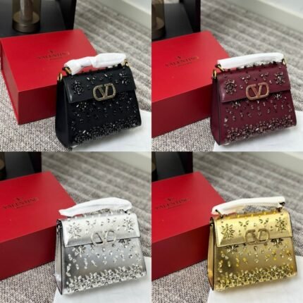This is the star-diamond version of Valentino’s tote bag, centered on the brand’s iconic V-shaped metal buckle design. The bag