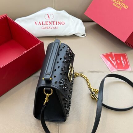 Valentino V-Shaped Full-Diamond Bag – Black Leather Shoulder Bag, Light Luxury Evening-Style Women’s Bag(27*6*12/cm)