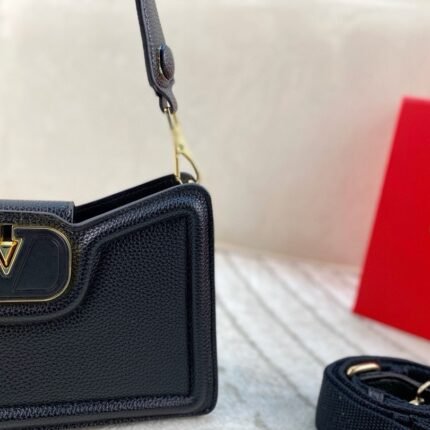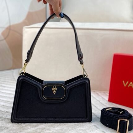 Valentino V-Logo Trapezoid Underarm Bag – Black Leather Shoulder Bag, Light Luxury Fashion Women’s Bag(26*15cm)