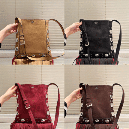 Valentino Studded Fringe Bucket Bag: Edgy Luxury with Versatile Hues (28×30cm)