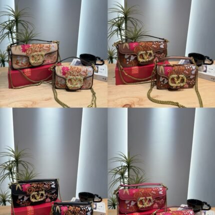 This Valentino embroidered shoulder bag collection showcases intricate floral embroidery and the iconic V-logo hardware, available in two sizes—27×12cm (large)