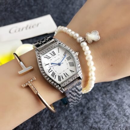 This Cartier watch collection features a distinctive tonneau case, Roman numeral dials, and dazzling diamond embellishments, available in silver, gold,
