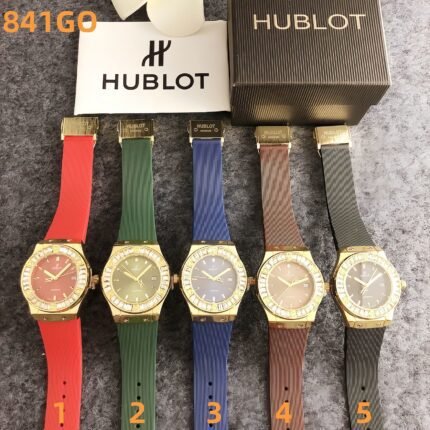 Hublot 841GO series watches embody avant-garde luxury, featuring bold cases with crystal-encrusted bezels, vibrant rubber straps in shades like red,