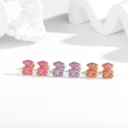 TOUS 925 Silver Spanish 3D Bear Full Pink Zircon Inlaid Earstuds