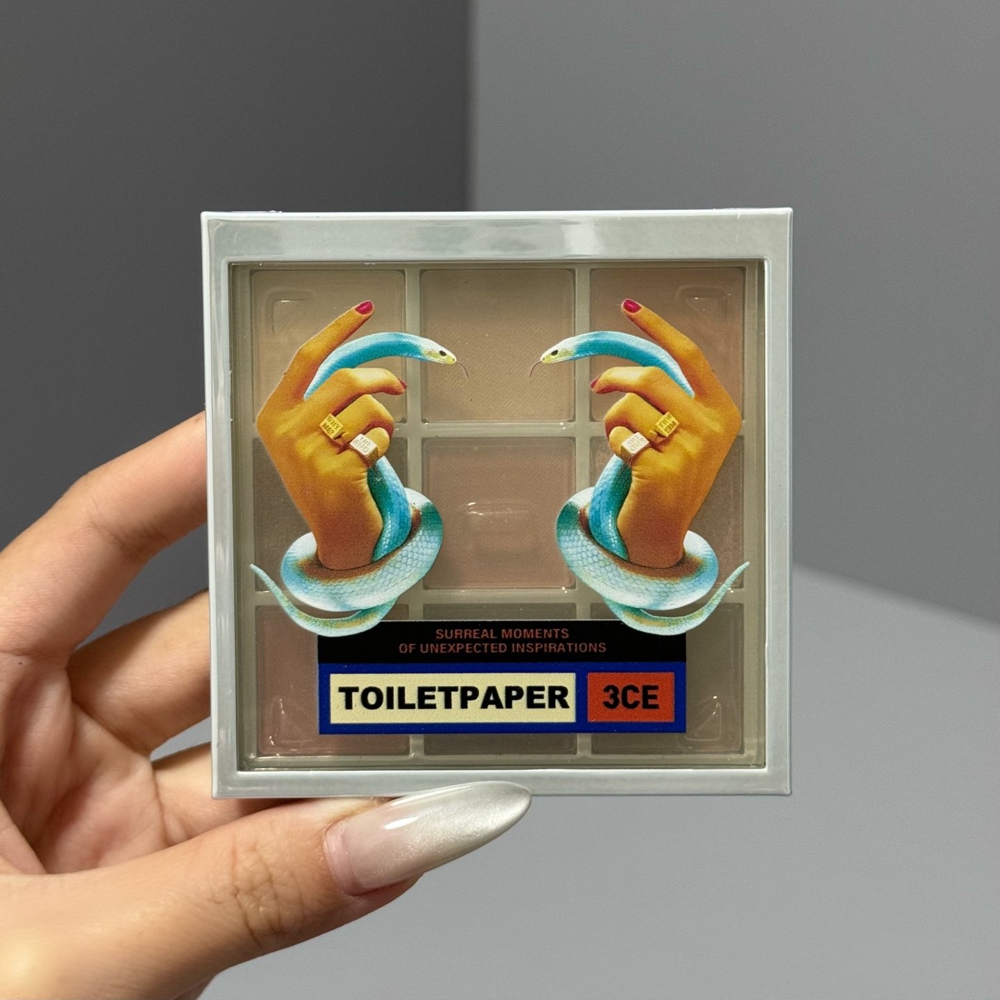 The 9-color snake eyeshadow palette features a powder texture that blends easily with minimal flyaways.