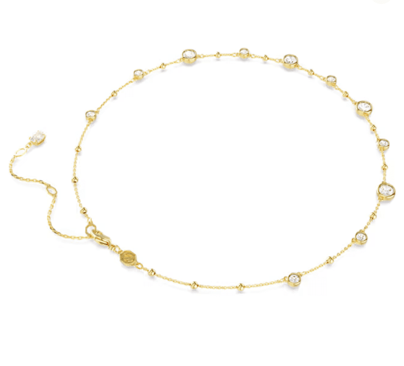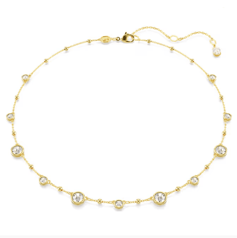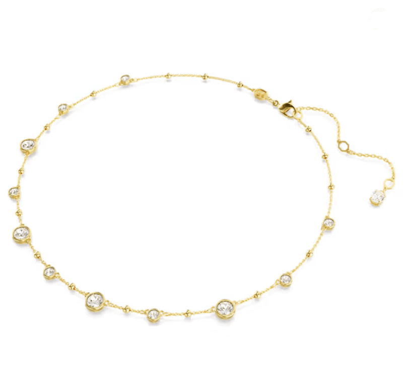 This full circle necklace from the Imber collection. The gold-plated chain design and the chain-like setting are decorated with shining metal drops and dazzling round-cut focal stones, adding a luxurious touch.