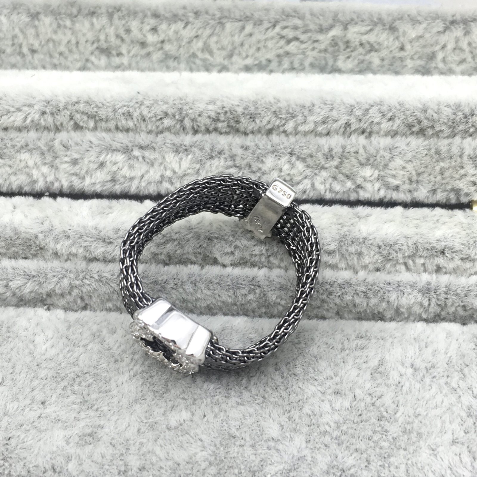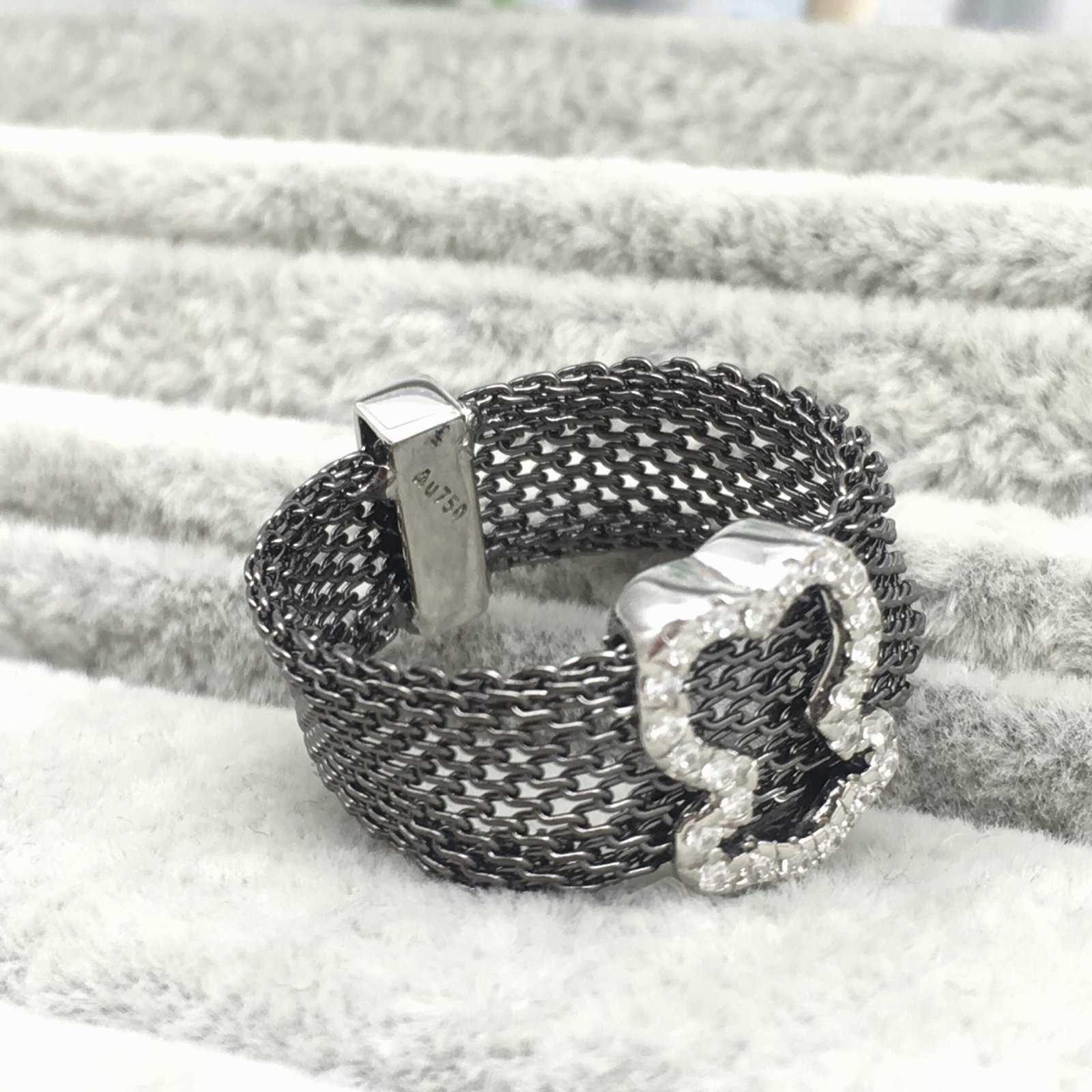 Icon Mesh ring in black IP steel and 18kt white gold with diamonds. Total weight: 0.14ct. Size: 1.1cm.