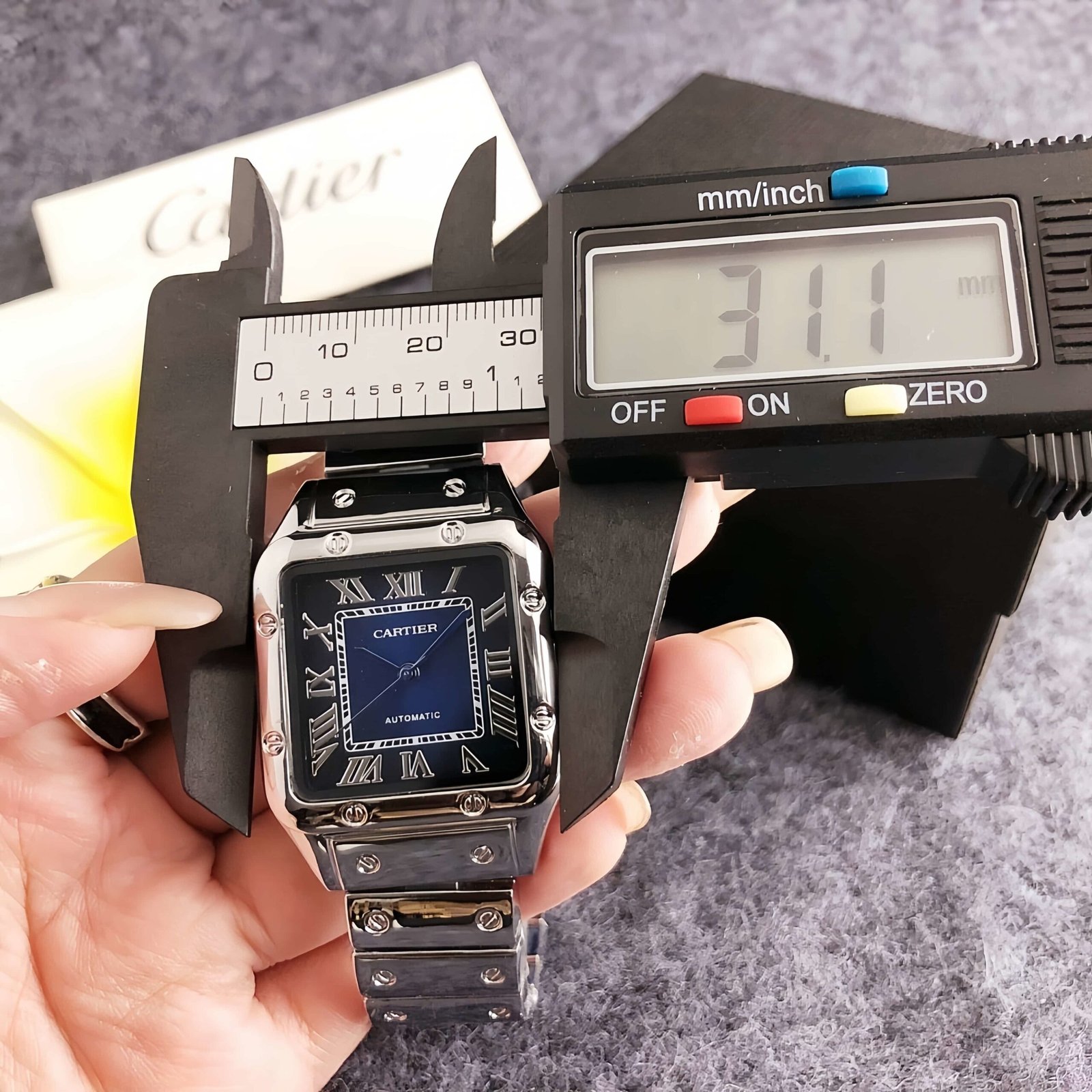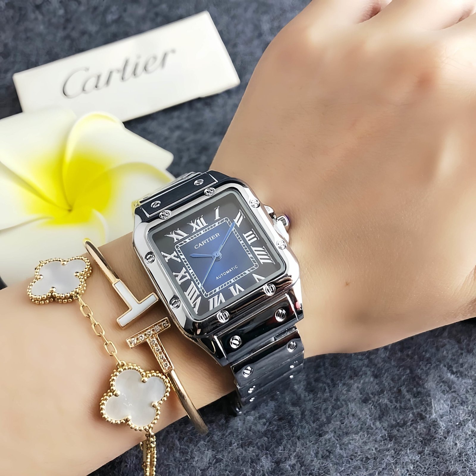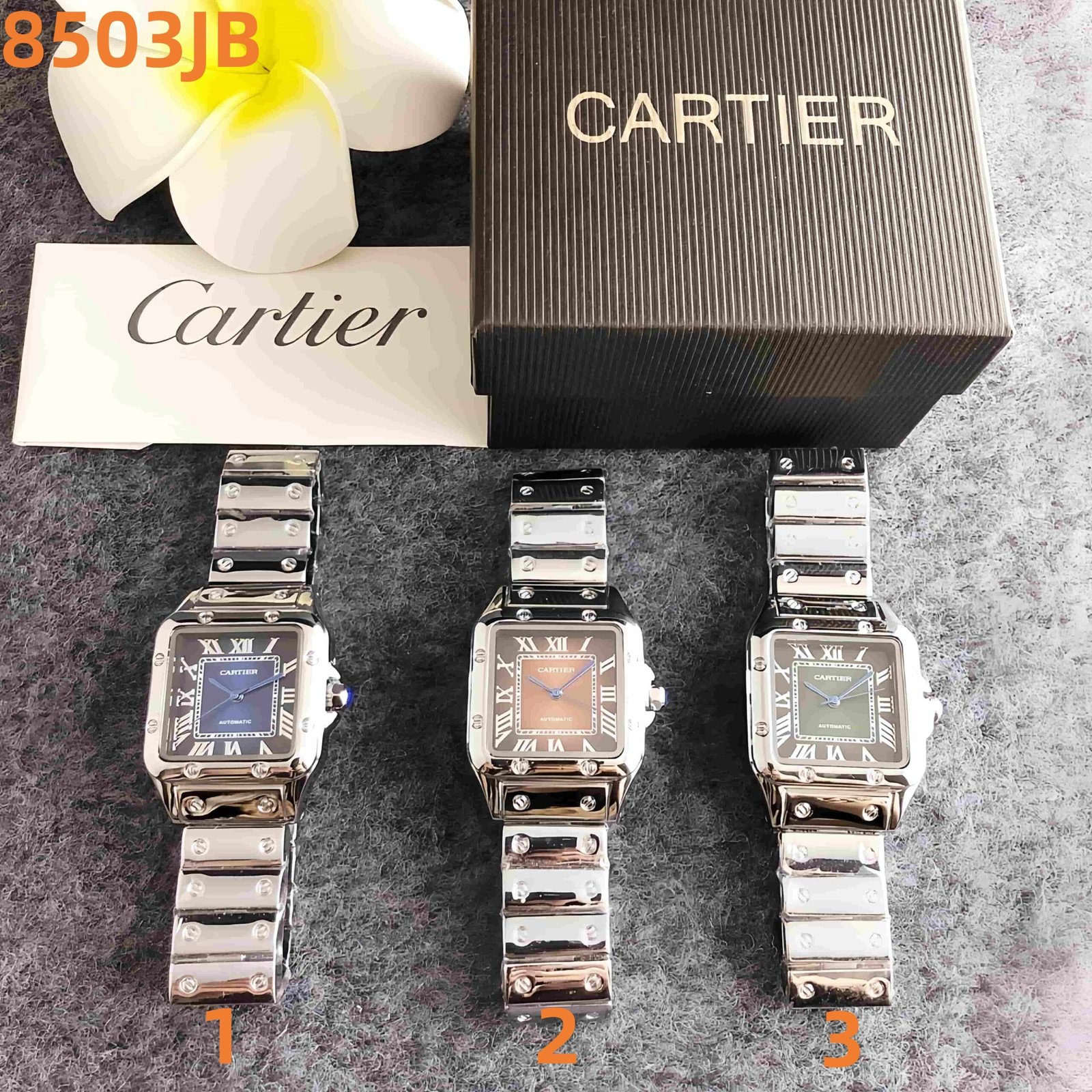 Cartier 8503JB series watches feature the iconic square design with Roman numerals, embodying Cartier’s legendary craftsmanship and sophisticated style. Available in elegant dial colors like blue, brown, and green, paired with sleek metal bracelets, these timepieces blend classic charm with modern appeal. Perfect for adding a touch of refined luxury to any look, they are ideal for both formal occasions and everyday sophistication, representing the epitome of Cartier’s enduring design legacy.