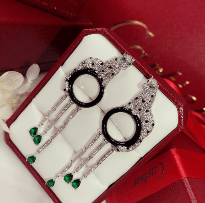 - Design Highlights: A three-dimensional panther motif fully set with brilliant diamonds, paired with a black enamel hoop for striking contrast. Three full-diamond tassel chains cascade down, each ending in a teardrop-shaped emerald that sways with your steps, capturing light and movement.