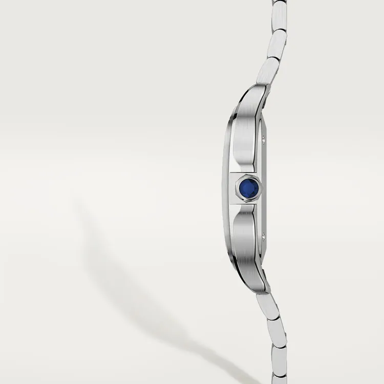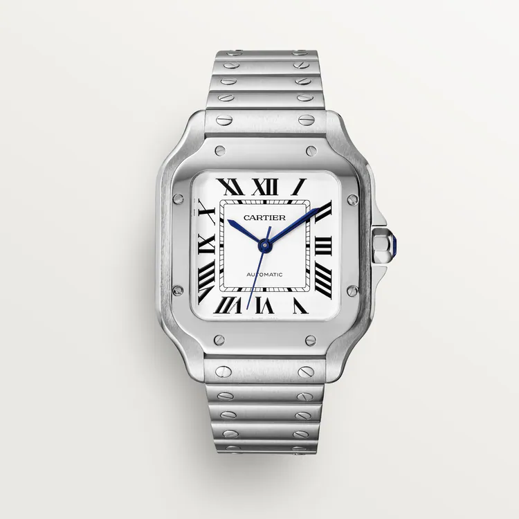 Santos watch, medium model, Manufacture mechanical movement with automatic winding, caliber 1847 MC. Steel case, 7-sided crown set with a faceted synthetic spinel, silvered opaline dial, steel sword-shaped hands, sapphire crystal. Steel bracelet with “SmartLink” adjustment system. Second bracelet in calfskin, with interchangeable steel folding buckle. Both bracelets are fitted with the “QuickSwitch” interchangeability system. Case width: 35.1 mm, thickness: 8.83 mm. Water-resistant up to 10 bar (approx. 100 meters/100 feet).