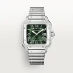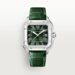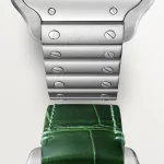 Santos de Carter watch, medium model, mechanical movement with automatic winding 1847 MC. Steel case, 7-sided crown with synthetic faceted blue spinel, graduated green dial, polished steel sword-shaped hands with luminescent material, sapphire crystal. Steel bracelet with SmartLink adjustment system. Second strap in green alligator skin, with interchangeable steel folding buckle. Both are fitted with the QuickSwitch interchangeable system. Case width: 35.1 mm, thickness: 8.83 mm. Water-resistant up to 10 bar (approx. 100 meters/330 feet).