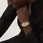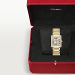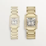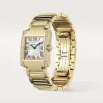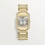 Tank Française watch, medium model, quartz movement. Case and faceted crown in 18K yellow gold (750/1000) set with 27 brilliant-cut diamonds totaling 1.22 carats. Golden sunray dial, blued-steel sword-shaped hands, sapphire crystal. Bracelet in 18K yellow gold (750/1000). Case dimensions: 32 mm x 27 mm, thickness: 7.1 mm. Water-resistant up to 3 bar (approx. 30 meters/100 feet).