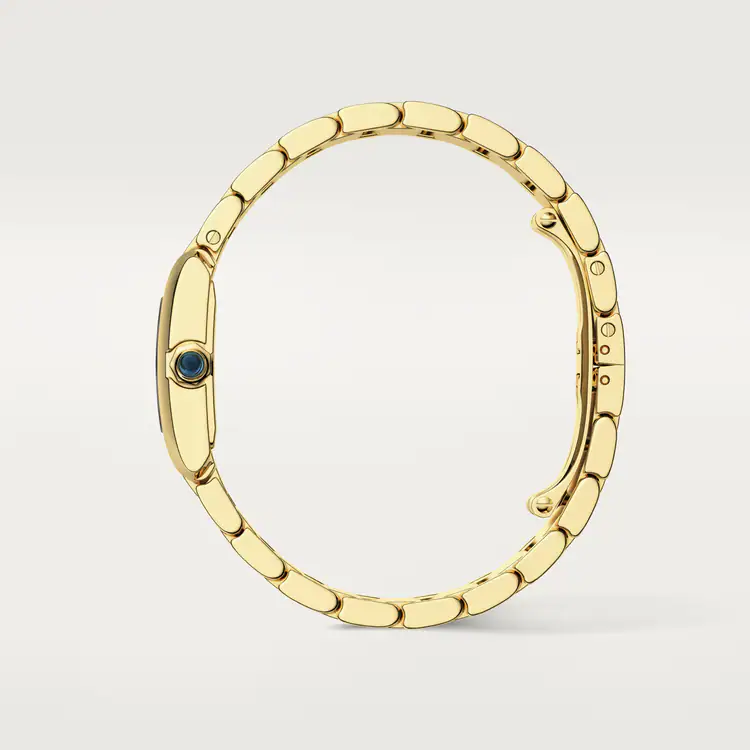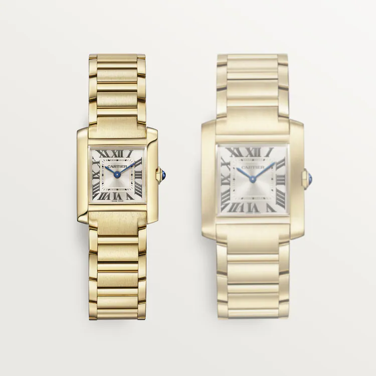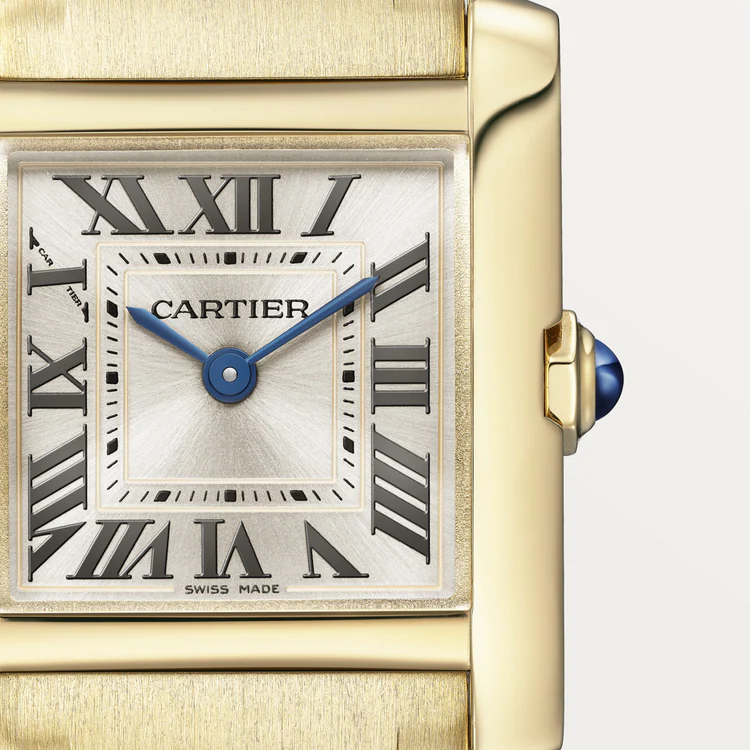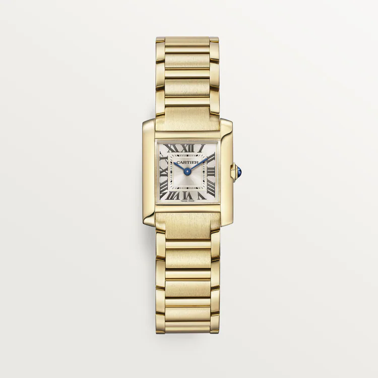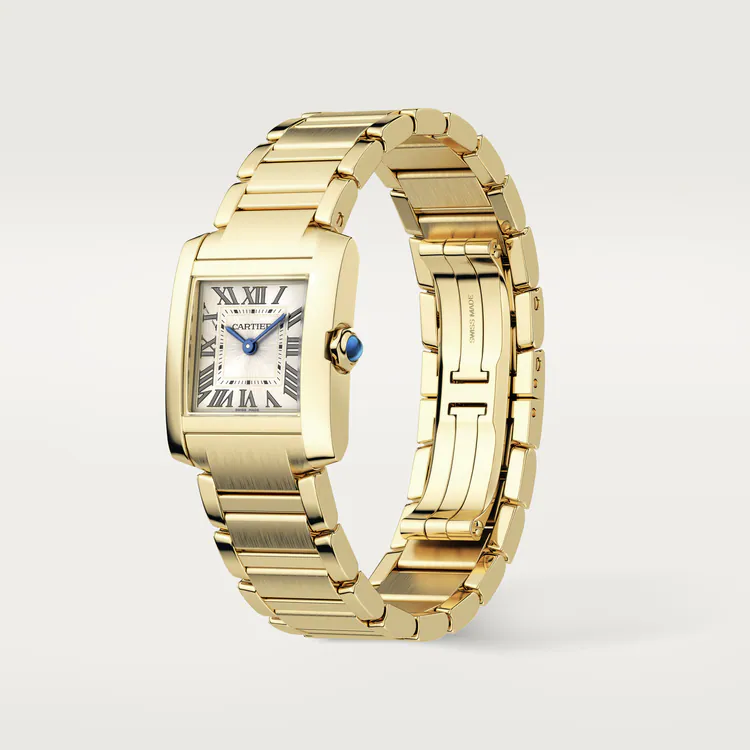 Tank Française watch, small model, quartz movement. Case in 18K yellow gold (750/1000). Faceted crown in 18K yellow gold 750/1000 decorated with a sapphire cabochon. Golden sunray dial, blued-steel sword-shaped hands, sapphire crystal. Bracelet in 18K yellow gold (750/1000). Dimensions: 25.7 mm x 21.2 mm, thickness: 6.8 mm. Water-resistant to 3 bar (approx. 30 meters/100 feet).