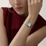 ank Française watch, small model, quartz movement. Steel case. Faceted crown in steel decorated with a synthetic cabochon-shaped spinel. Silvered sunray dial, blued-steel sword-shaped hands, sapphire crystal. Steel bracelet. Case dimensions: 25.7 mm x 21.2 mm, thickness: 6.8 mm. Water-resistant up to 3 bar (approx. 30 meters/100 feet).