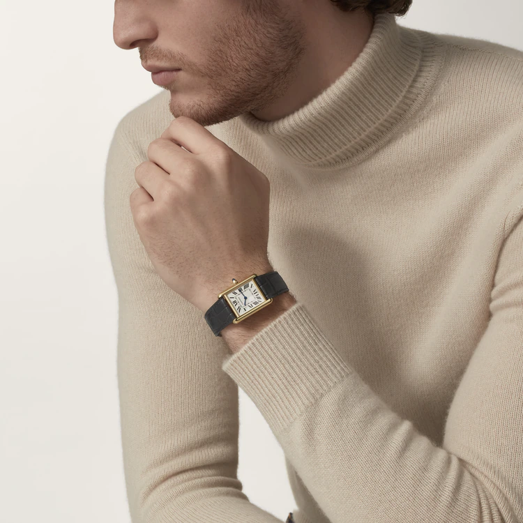 Tank Louis Cartier watch, large model, quartz movement. Case in 18K yellow gold (750/1000), beaded crown set with a sapphire, grained silvered dial, blued-steel sword-shaped hands, mineral crystal, strap in dark gray alligator skin, ardillon buckle in 18K yellow gold (750/1000). Case dimensions: 33.7 mm x 25.5 mm, thickness: 6.3 mm. Water-resistant up to 3 bar (30 meters/100 feet).