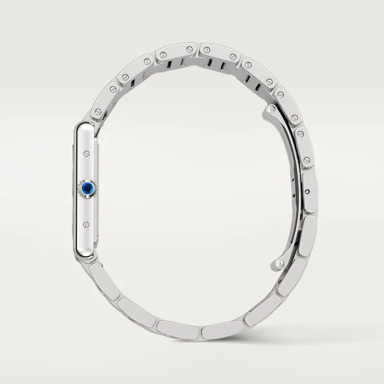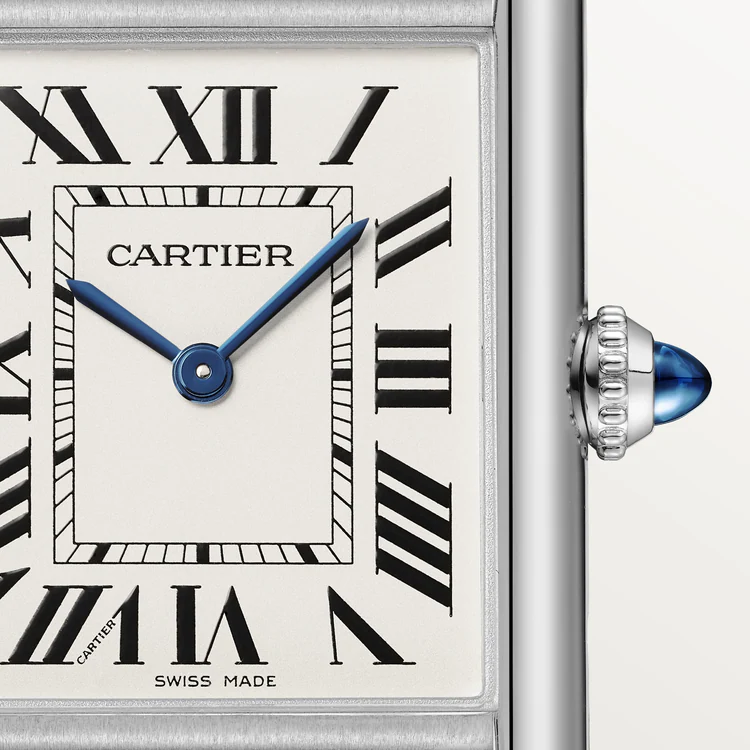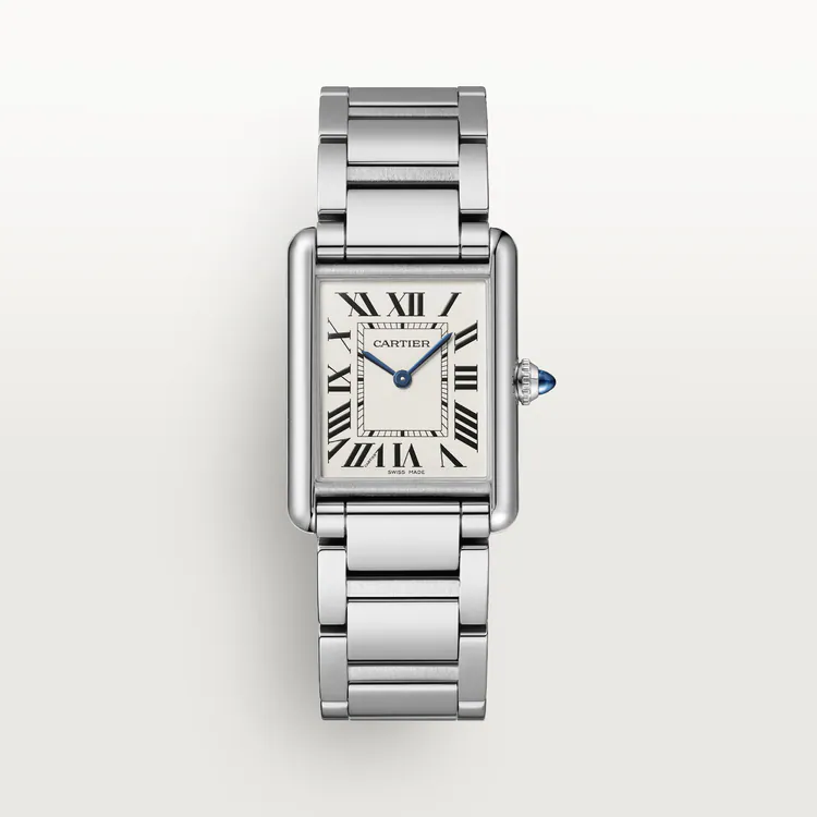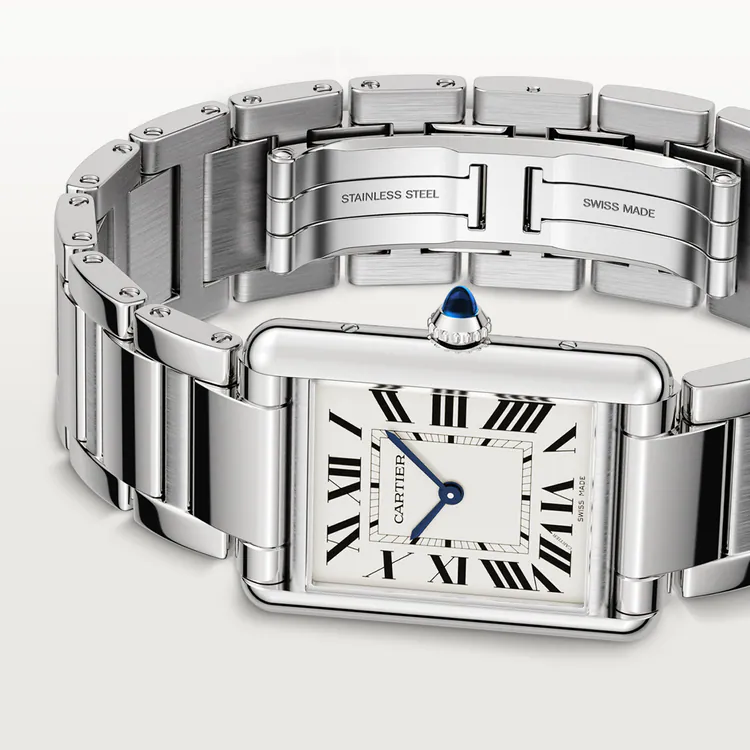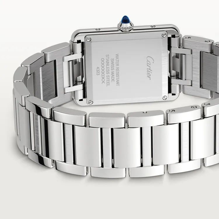 Tank Must watch, large model, high autonomy quartz movement. Steel case, beaded crown set with a synthetic cabochon-shaped spinel, silvered dial, blued-steel sword-shaped hands, interchangeable steel bracelet. Case dimensions: 33.7 mm x 25.5 mm, thickness: 6.6 mm. Water-resistant up to 3 bar (approx. 30 meters/100 feet).
