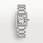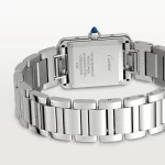 Tank Must watch, small model, high autonomy quartz movement. Steel case, beaded crown set with a synthetic cabochon-shaped spinel, silvered dial, blued-steel sword-shaped hands, interchangeable steel bracelet. Case dimensions: 29.5 mm x 22 mm, thickness: 6.6 mm. Water-resistant up to 3 bar (approx. 30 meters/100 feet).