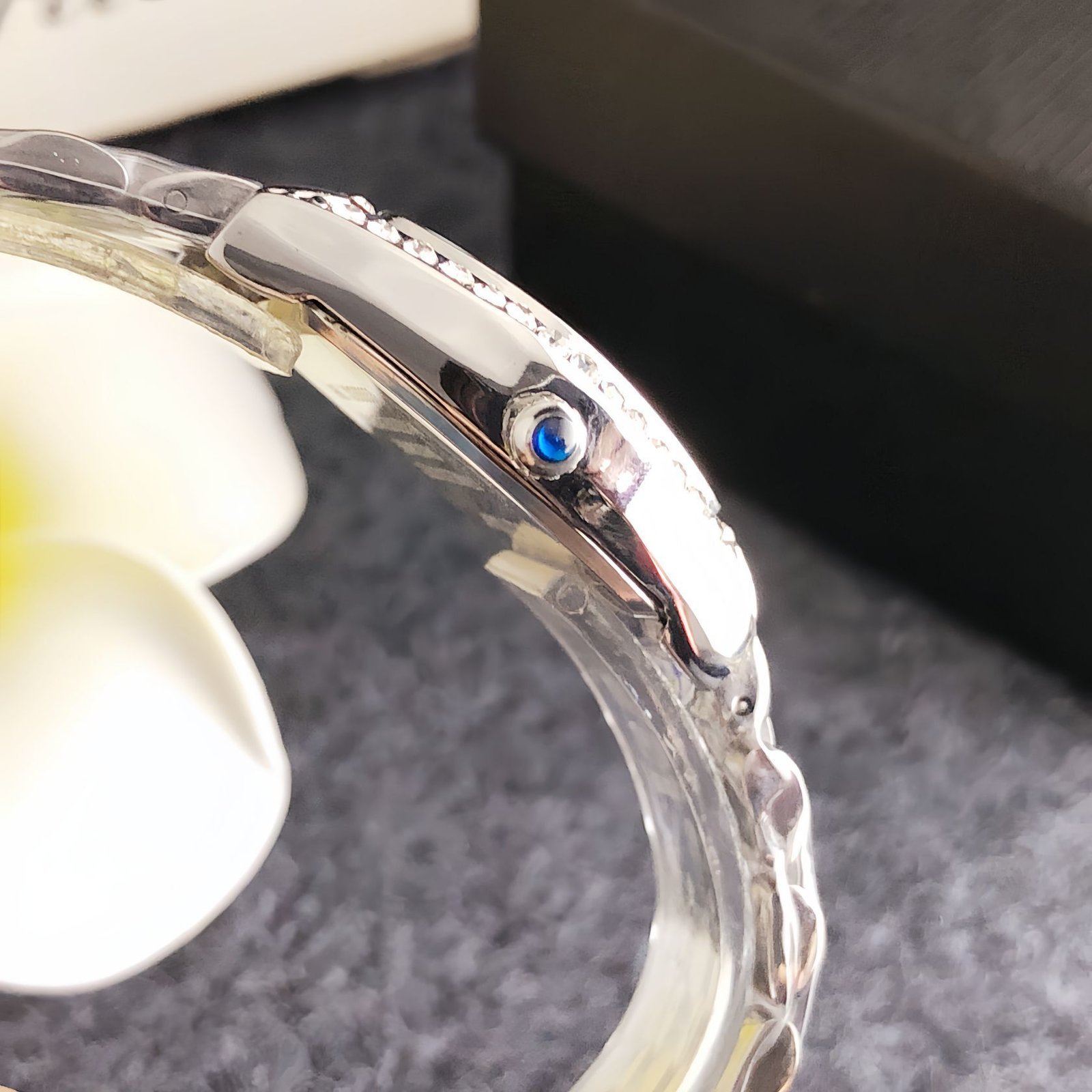ank Française watch, small model, quartz movement. Steel case. Faceted crown in steel decorated with a synthetic cabochon-shaped spinel. Silvered
