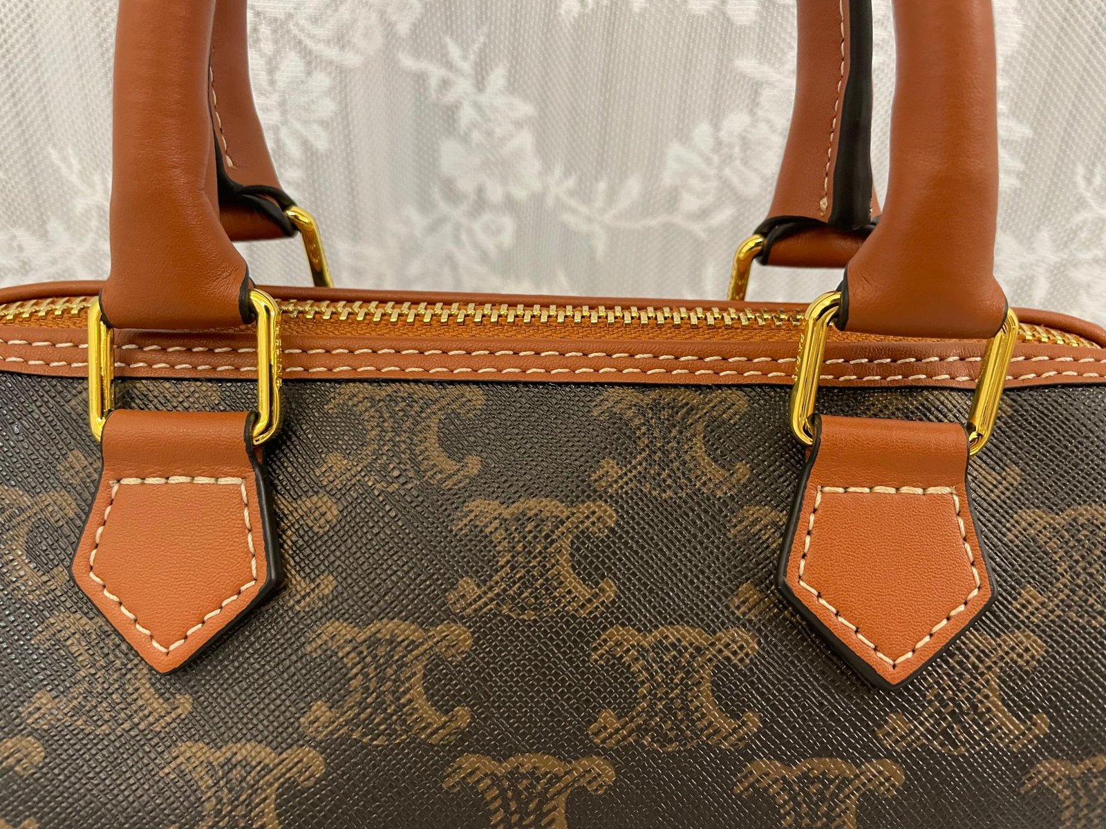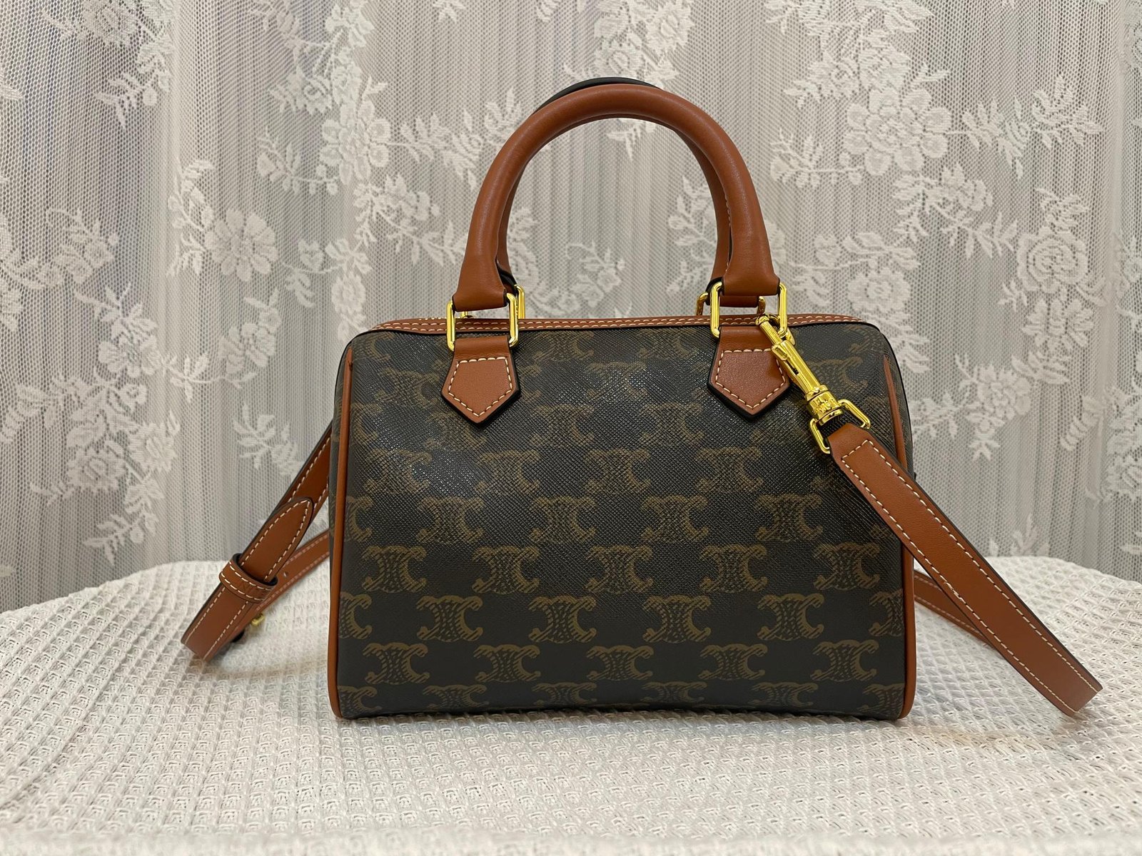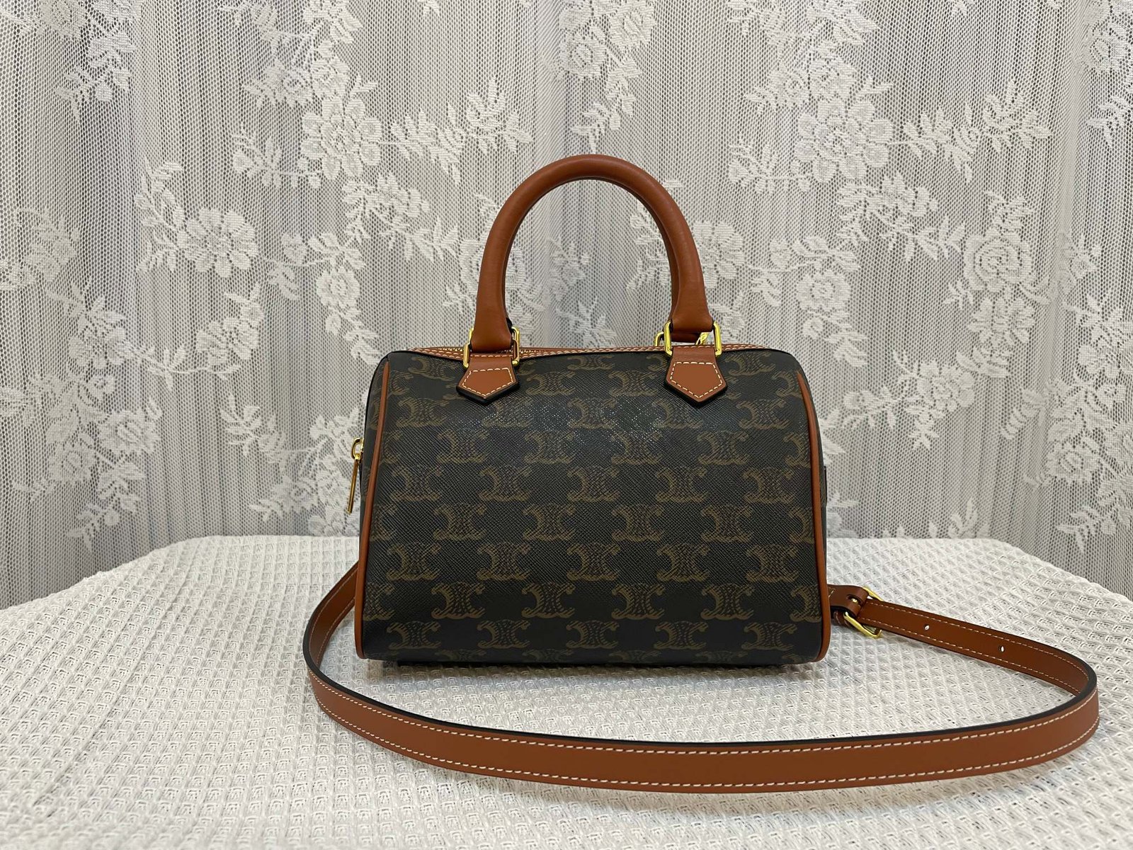 CELINE Small logo print Cow leather Boston Bag TRIOMPHE CANVAS logo print, small size is just right for the upper body, tall and small people can handle it ~ cow leather edge, fabric lining, zip lock, 1 main compartment, inner zip pocket, leather arm length 8cm