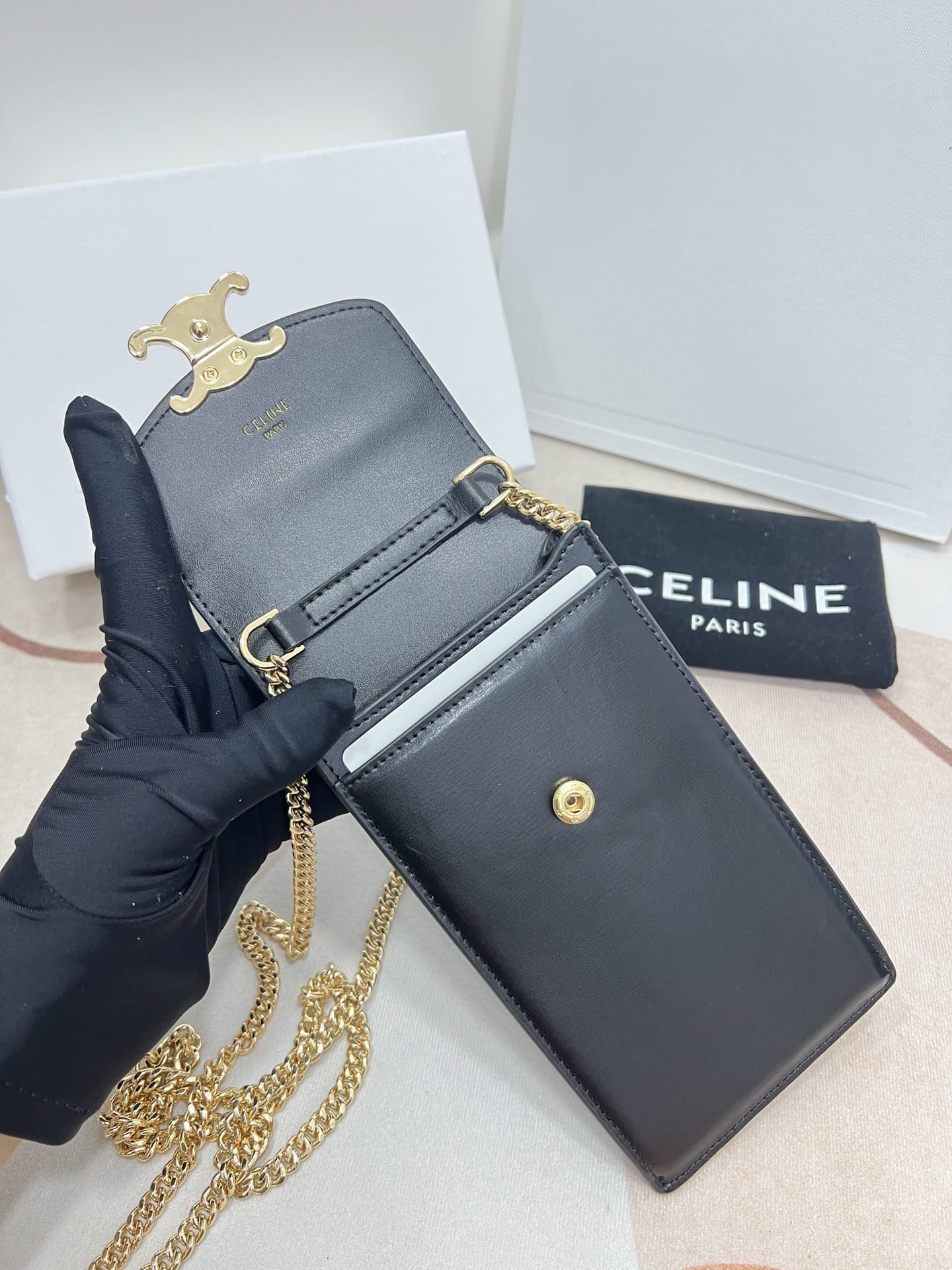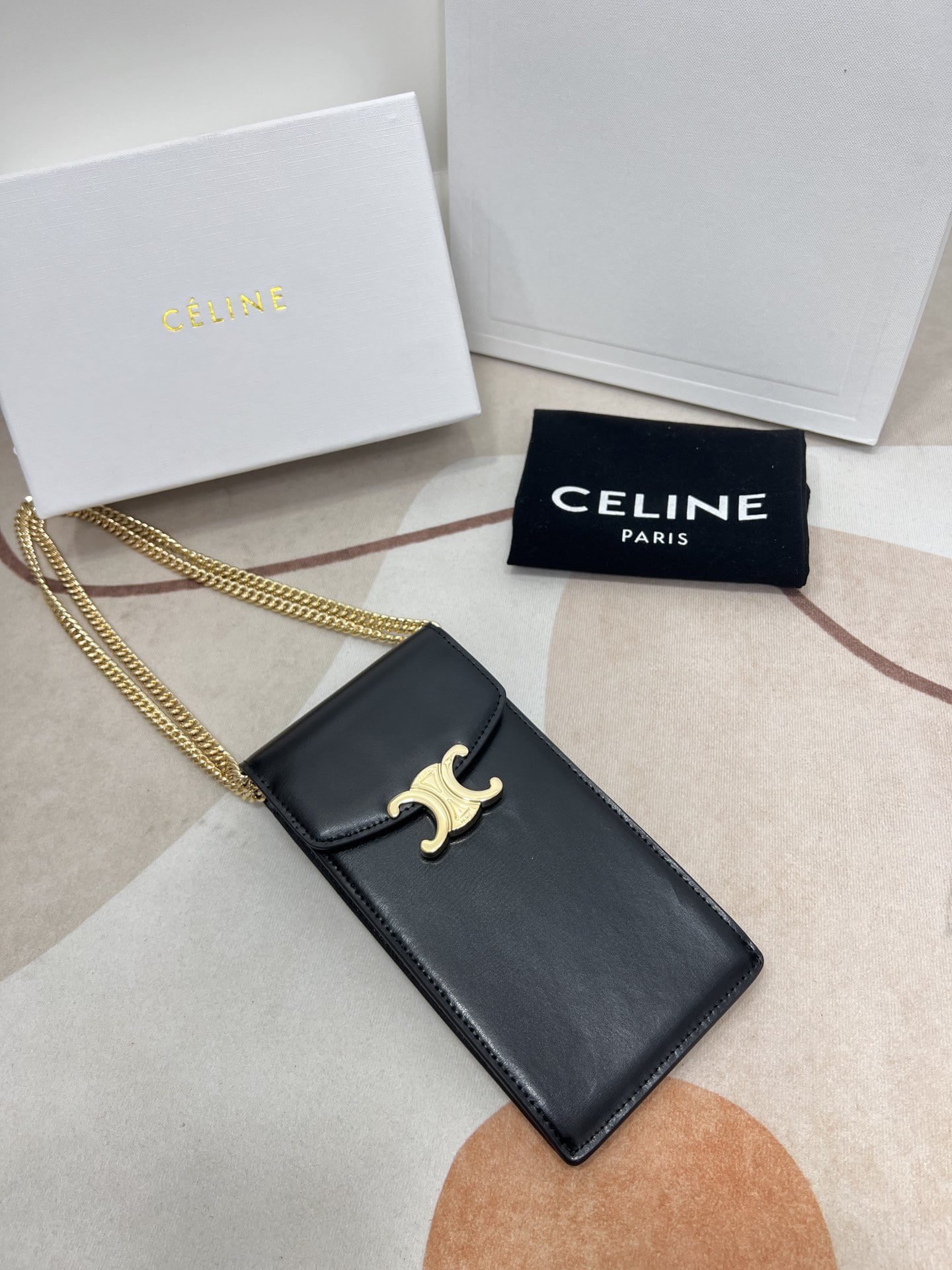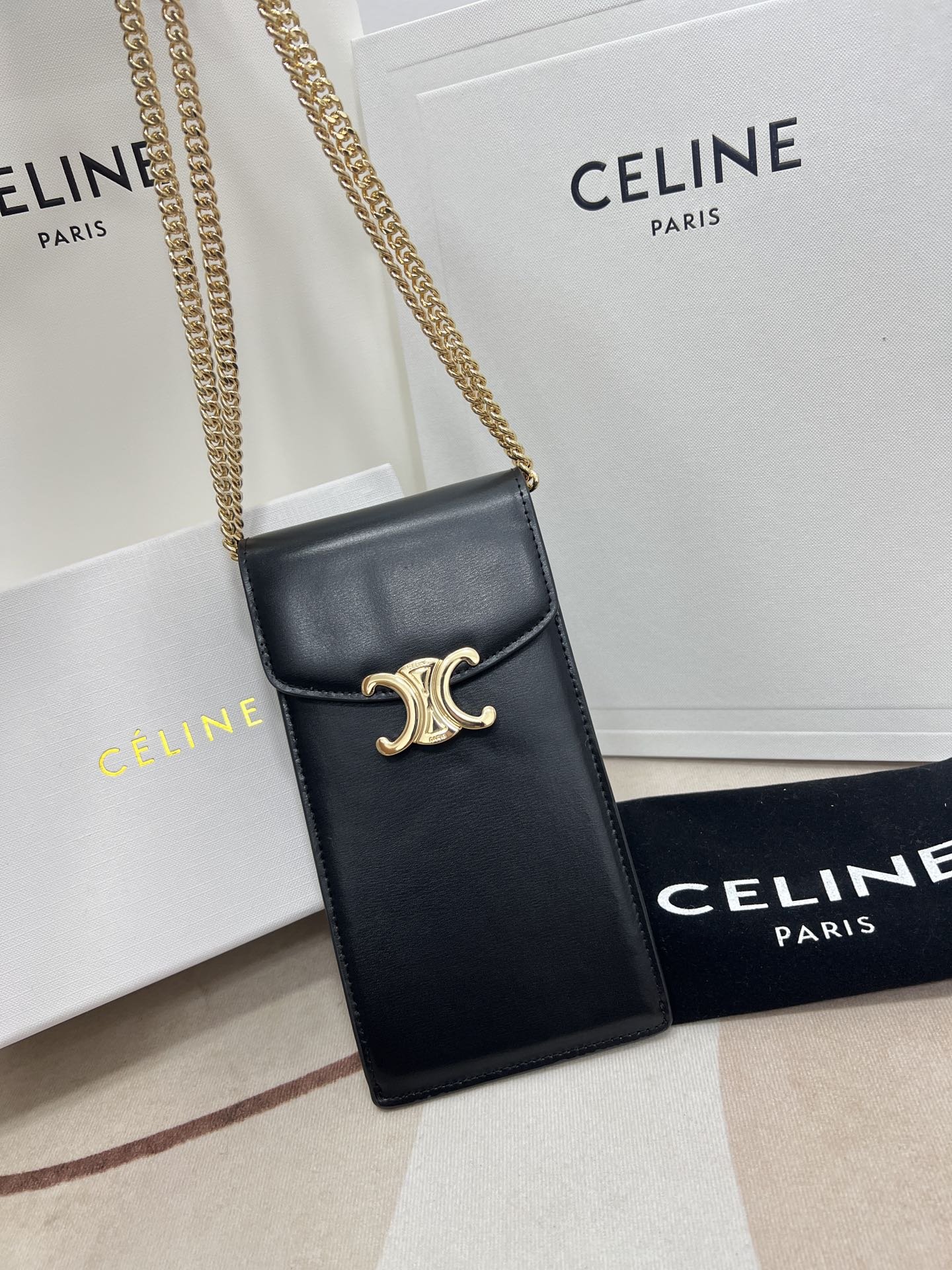 CELINE 2022???? New product – Arc de Triomphe mobile phone bag, toothpick print calfskin texture is excellent, large Arc de Triomphe hardware logo embellish, simple and unique C family wind