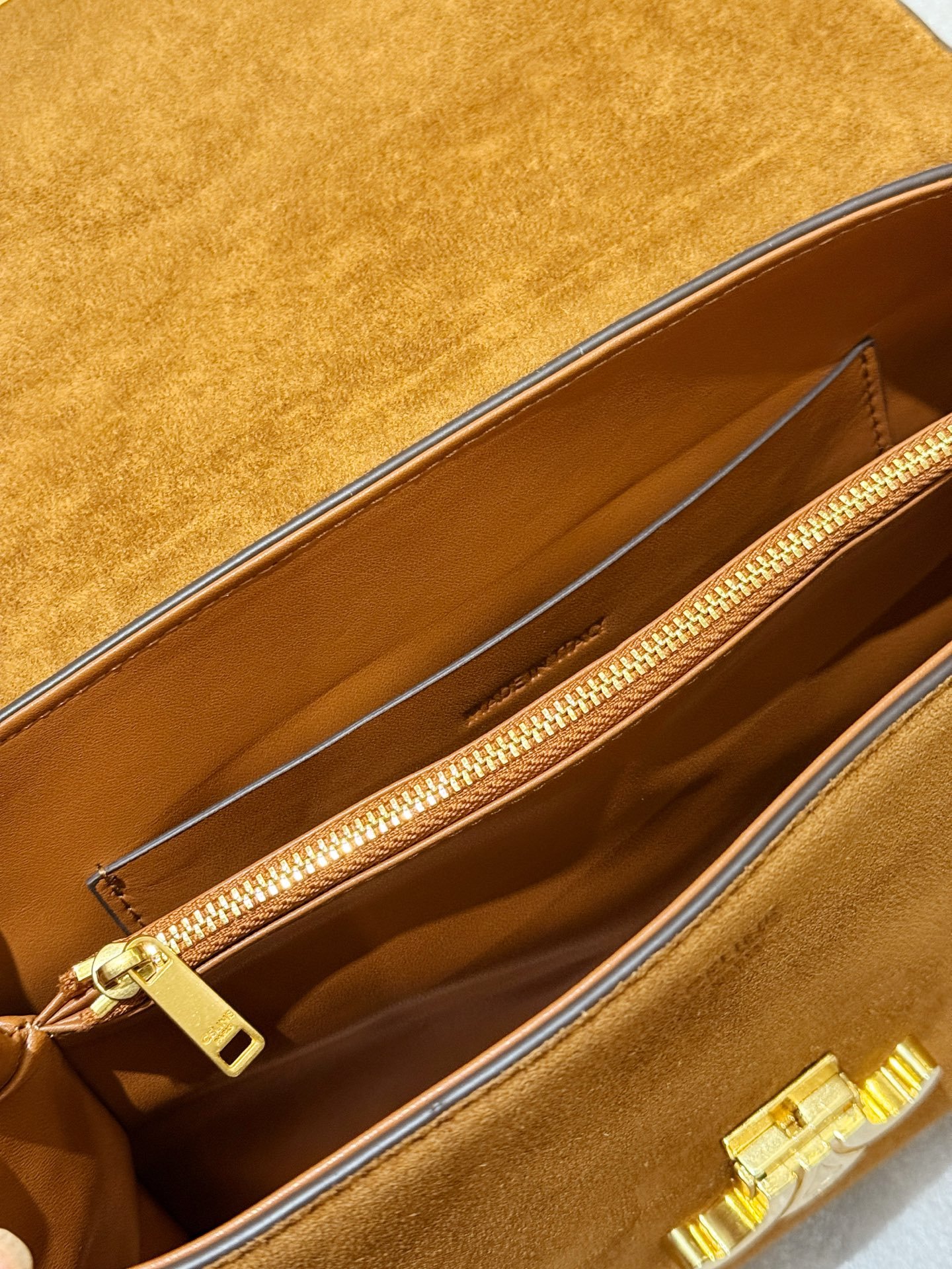 This Celine Nino top handle bag showcases premium suede craftsmanship, featuring the iconic Triomphe hardware, a sophisticated silhouette, and a size of 26*18cm in a stylish tan hue. With Celine’s legacy of minimalist elegance and tactile luxury, this bag seamlessly merges timeless sophistication with modern wearability. Perfect for those who appreciate a blend of plush suede texture and iconic design, it makes a refined statement suitable for any occasion, from daily commutes to elevated gatherings.