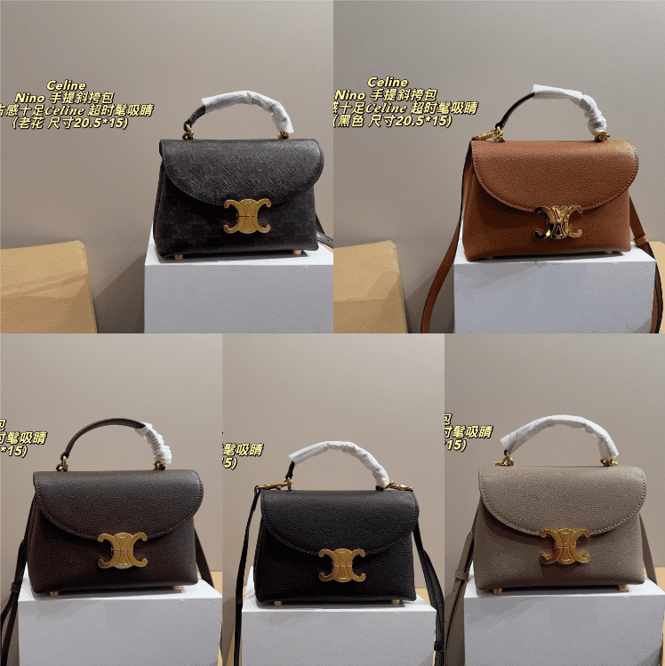 This Celine Nino top handle bag series showcases premium leather craftsmanship, featuring the iconic Triomphe hardware, a compact size of 20.5*15cm, and a range of sophisticated hues including monogram, tan, burgundy, black, and beige. With Celine’s legacy of minimalist elegance and timeless design, these bags seamlessly merge classic sophistication with everyday functionality. Perfect for those who appreciate a blend of tactile luxury and versatile style, they make a refined statement suitable for any occasion, from daily commutes to elevated gatherings.
