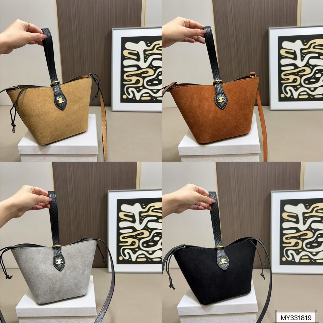 This Celine bucket bag series showcases premium suede craftsmanship, featuring the iconic hardware accent, a chic bucket silhouette, and a size of 15*16cm, available in sophisticated hues like tan, brown, gray, and black. With Celine’s legacy of minimalist elegance and refined design, these bags seamlessly merge timeless sophistication with everyday functionality. Perfect for those who appreciate a blend of tactile luxury and understated style, they make a refined statement suitable for any occasion, from casual outings to elevated gatherings.