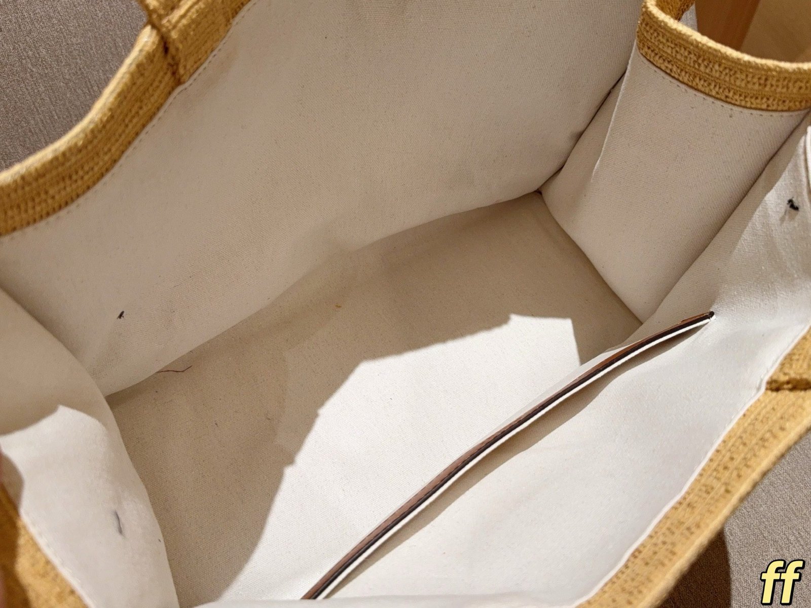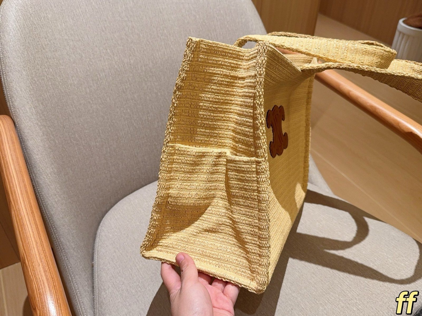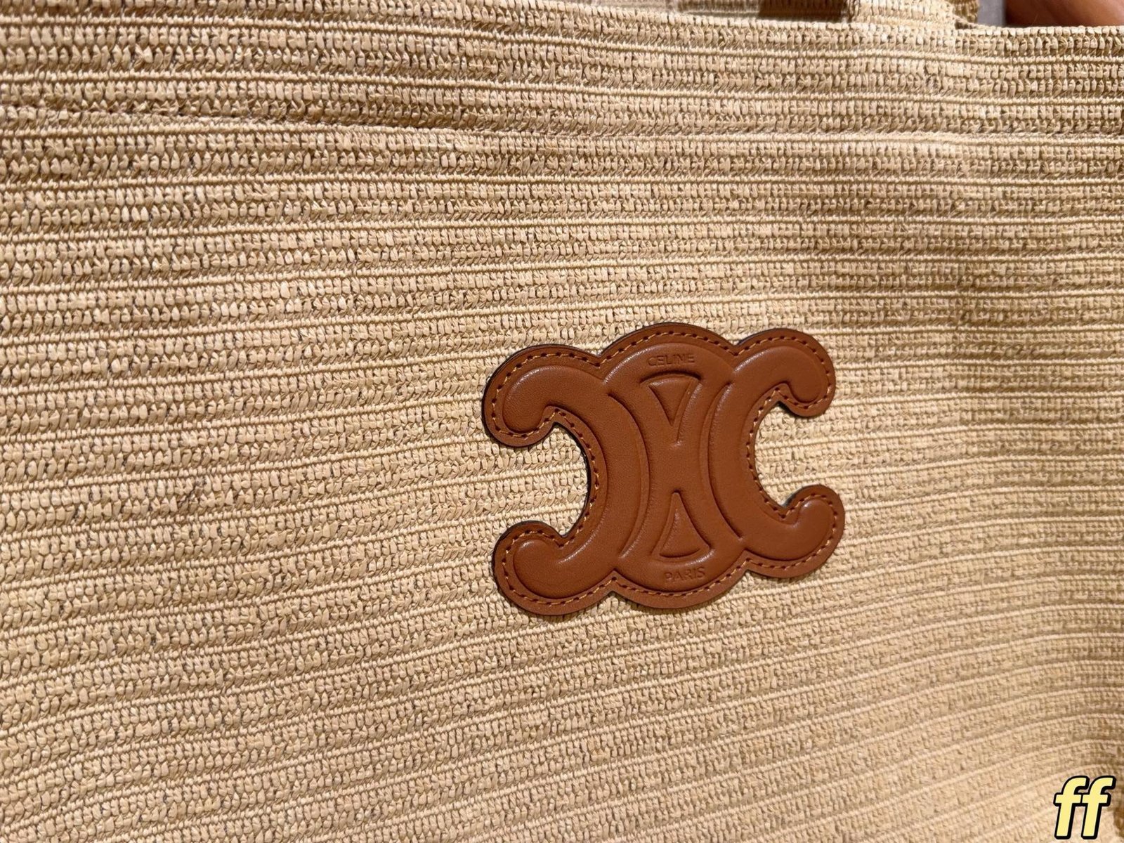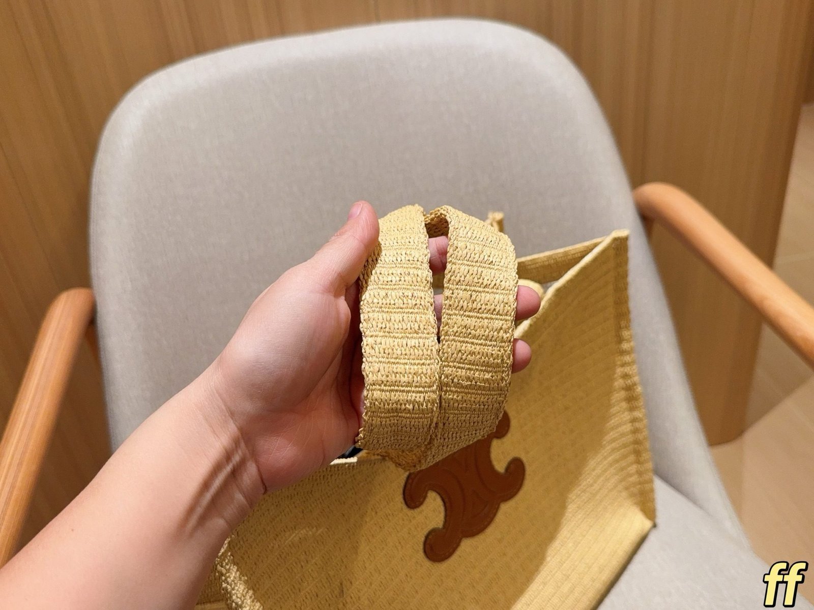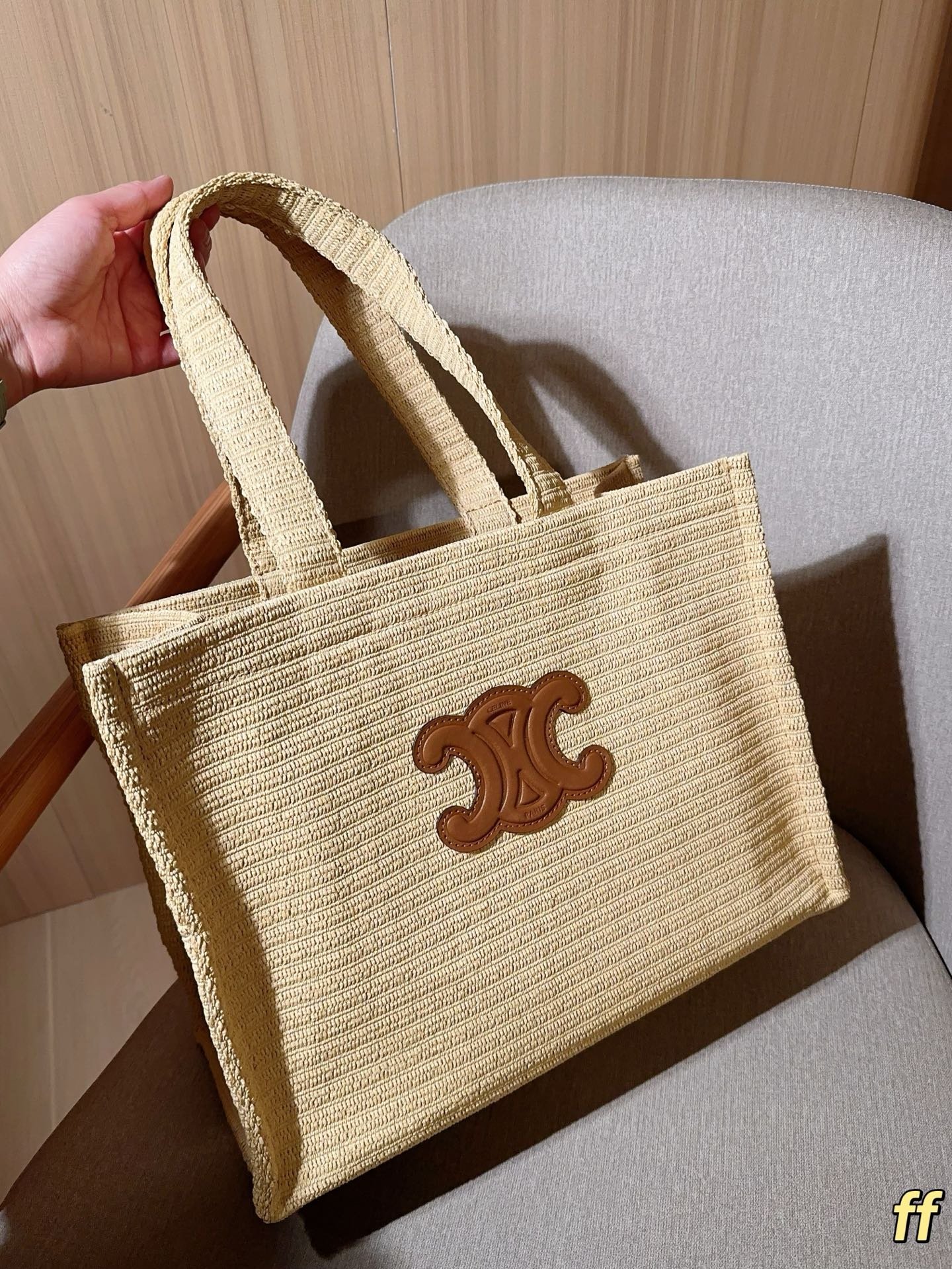 ✨ The Celine Triomphe Large Straw Tote Bag is crafted from natural straw, featuring the iconic Triomphe emblem in vintage brown leather. It exudes a laid-back resort vibe and French sophistication.