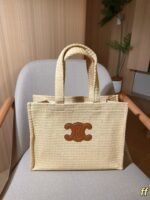✨ The Celine Triomphe Large Straw Tote Bag is crafted from natural straw, featuring the iconic Triomphe emblem in vintage brown leather. It exudes a laid-back resort vibe and French sophistication.