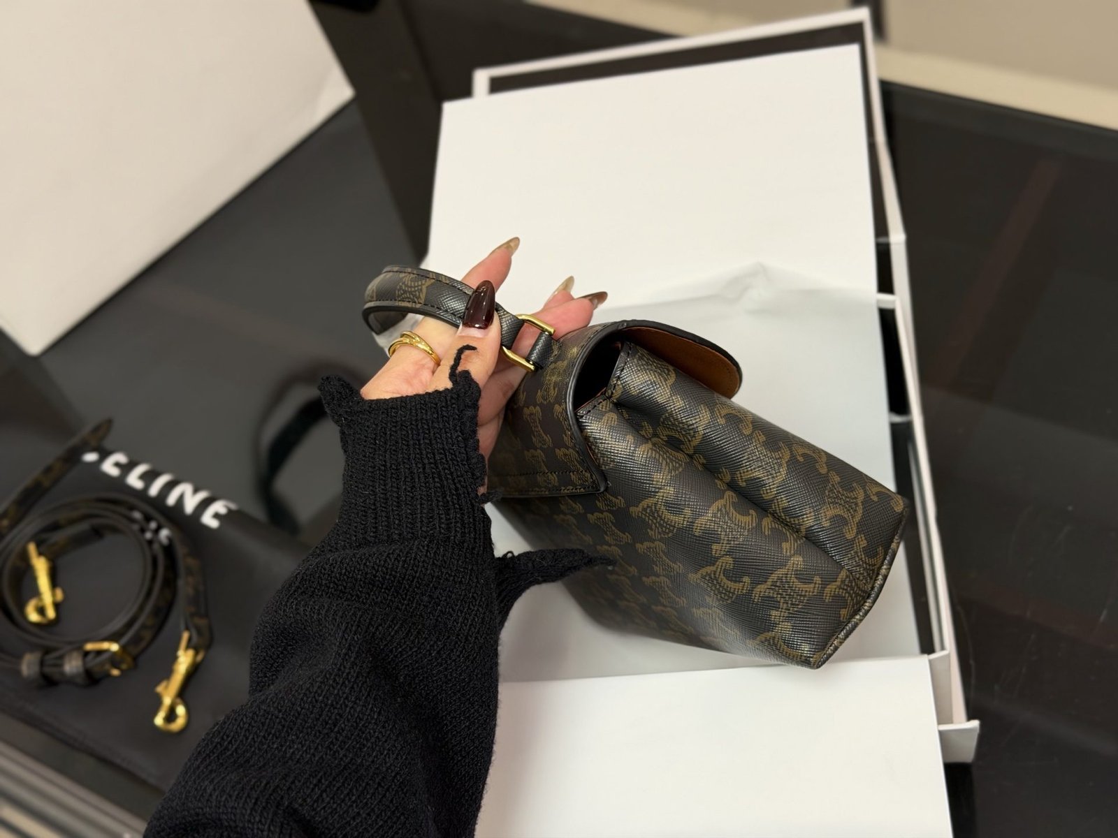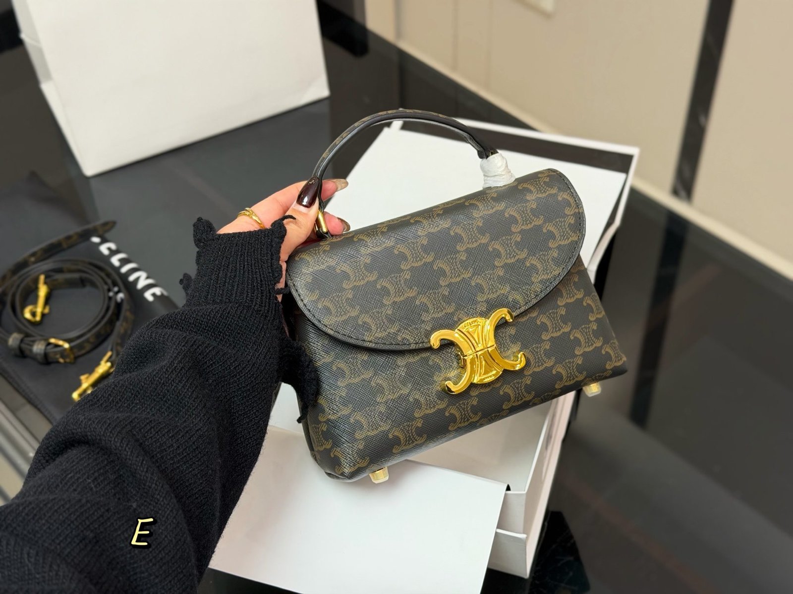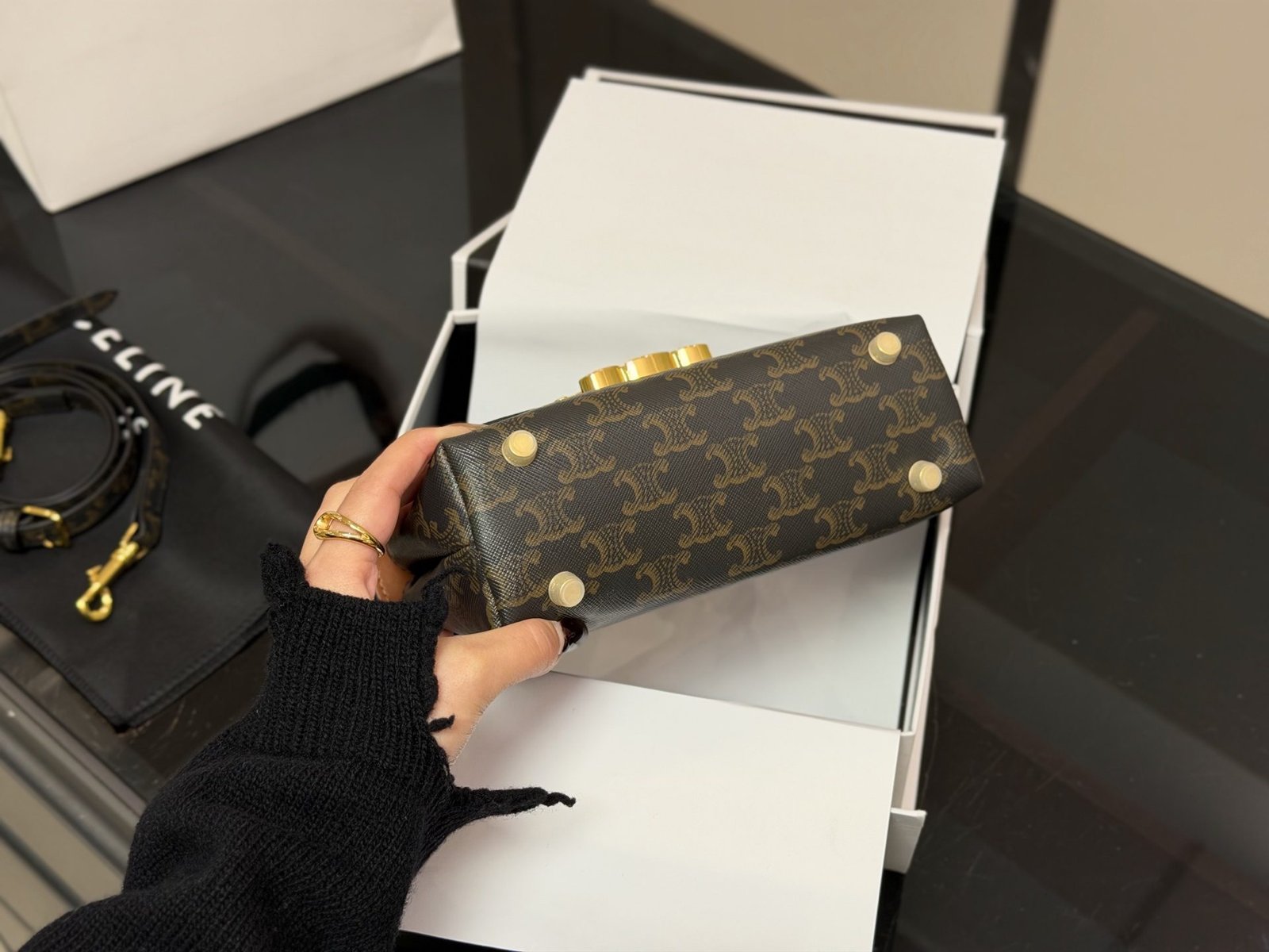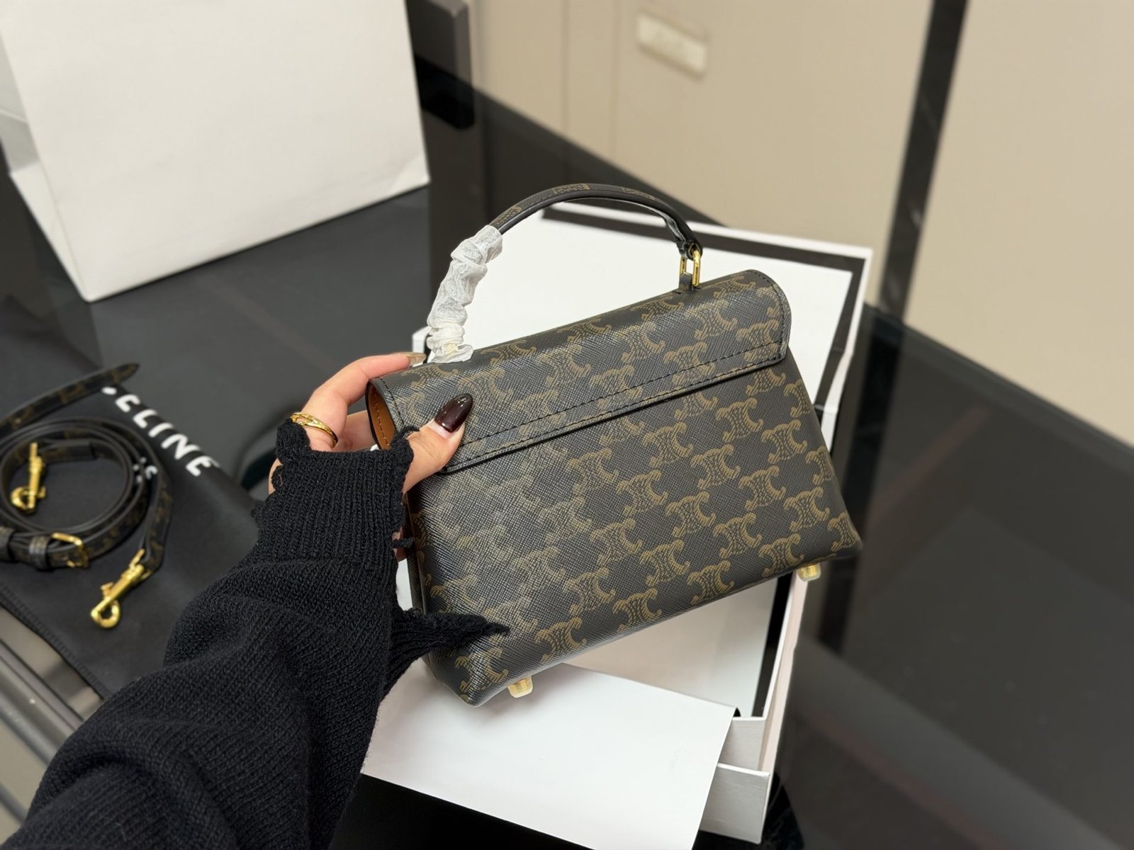 This Celine Triomphe mini bag showcases premium craftsmanship, featuring the iconic monogram pattern, the signature Triomphe hardware, and a compact size of 20cm. With Celine’s legacy of minimalist elegance and heritage design, this bag seamlessly merges classic branding with everyday functionality. Perfect for those who appreciate a blend of iconic style and versatile wear, it makes a sophisticated statement suitable for any occasion, from daily commutes to refined gatherings.