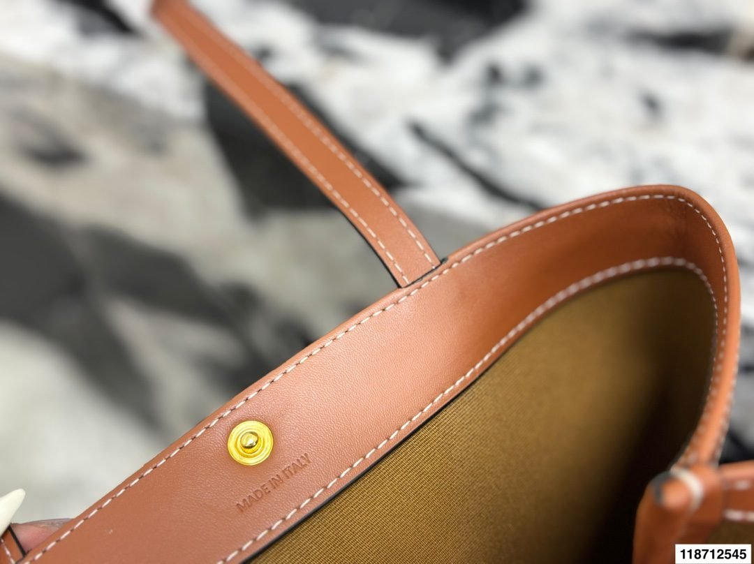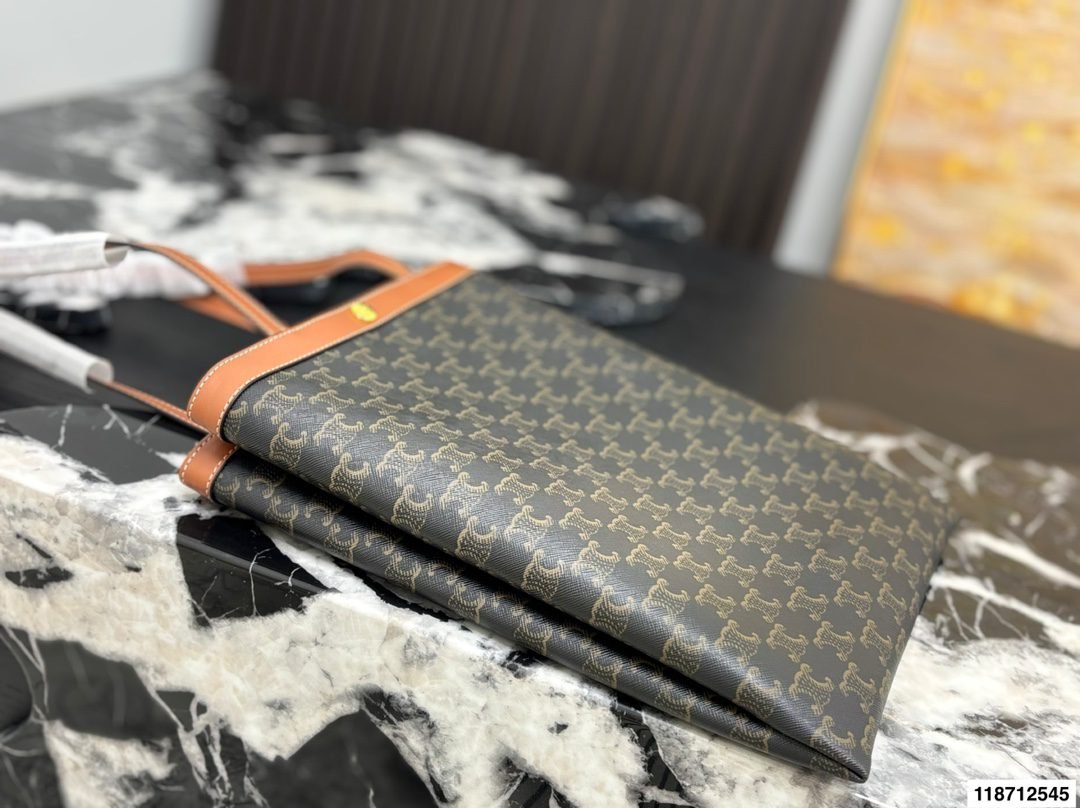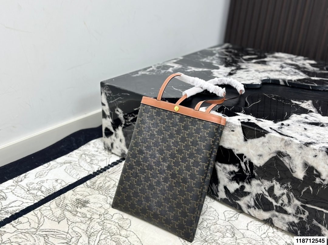 ✨ The iconic Celine Triomphe Tote Bag features the signature Triomphe monogram canvas paired with natural leather trim. The minimalist vertical tote silhouette exudes sophistication, with a metal snap button design that balances practicality and elegance.