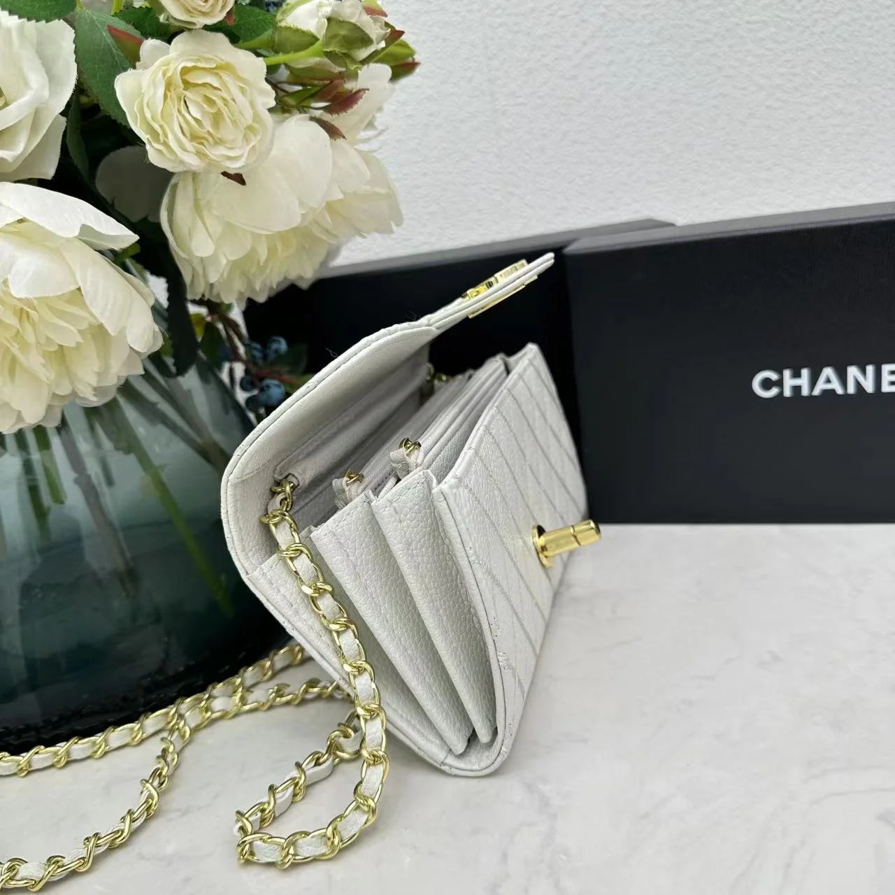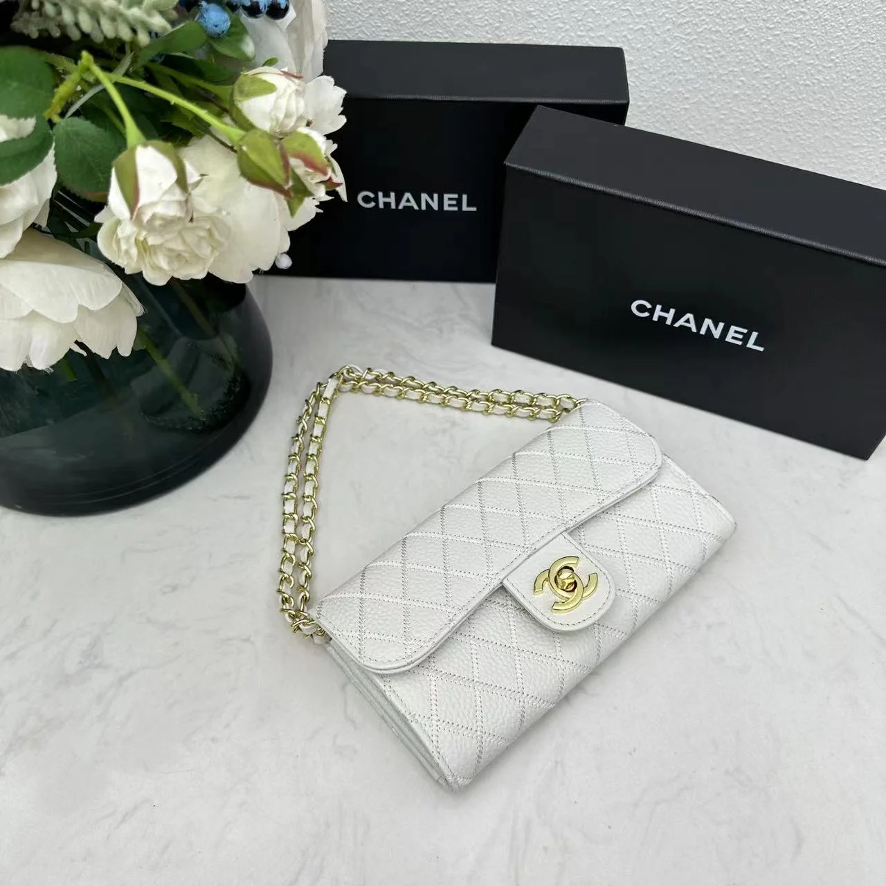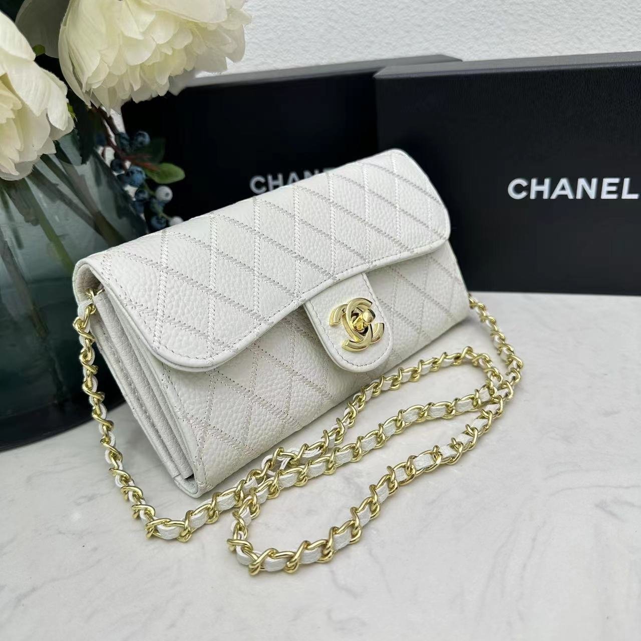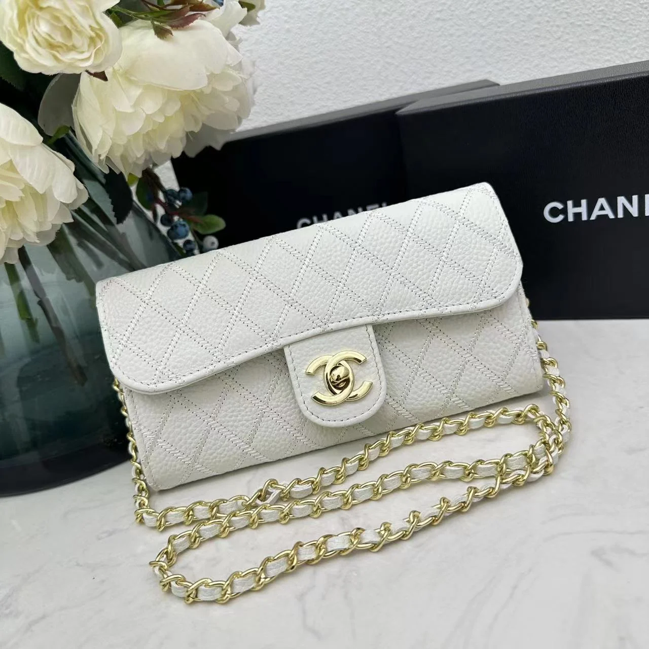 Chanel chain crossbody bag diamond and litchi cowhide White 50098 size: 19*10*3.5㎝