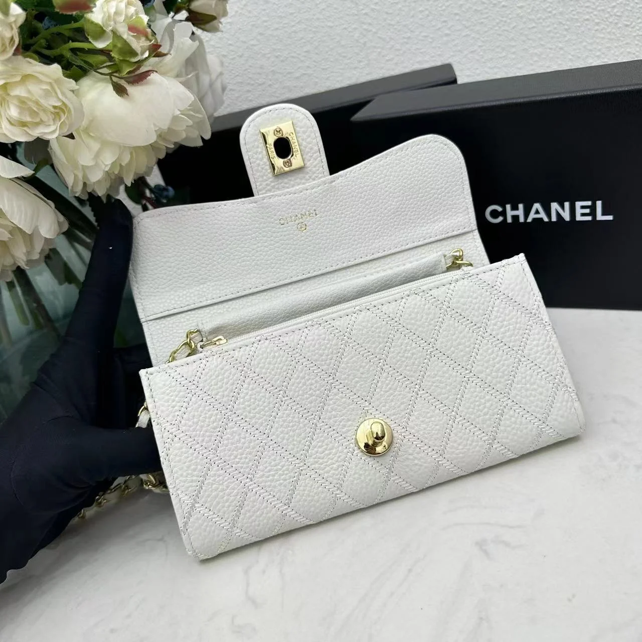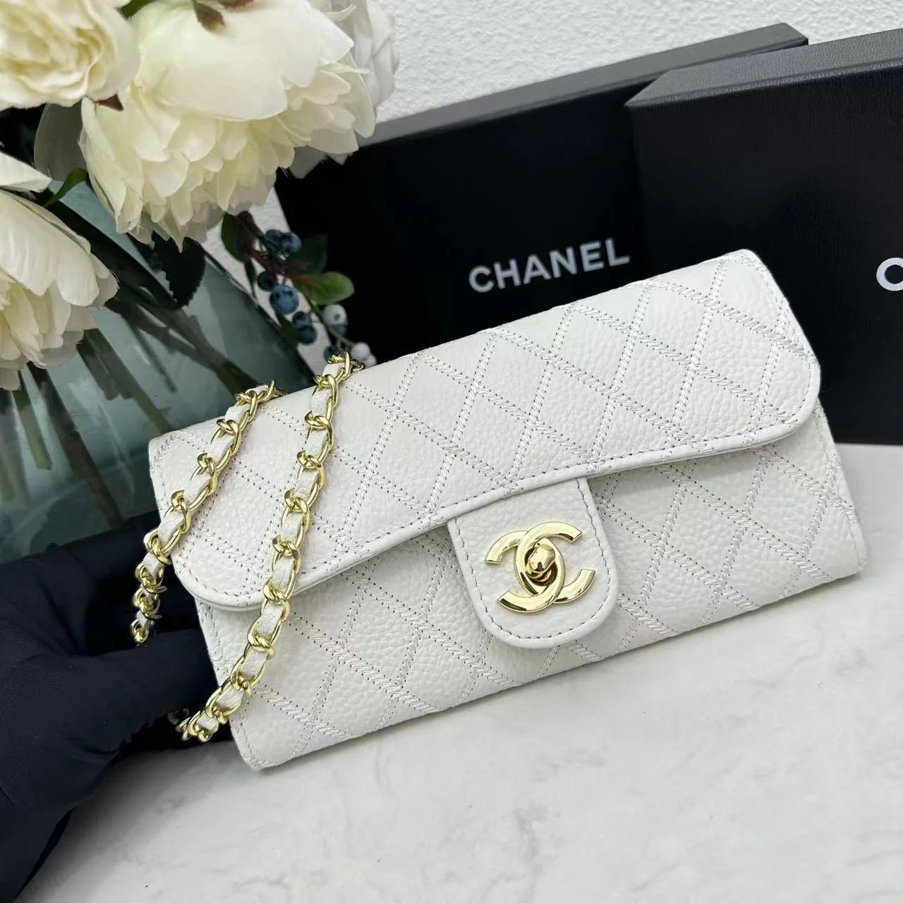 Chanel chain crossbody bag diamond and litchi cowhide white