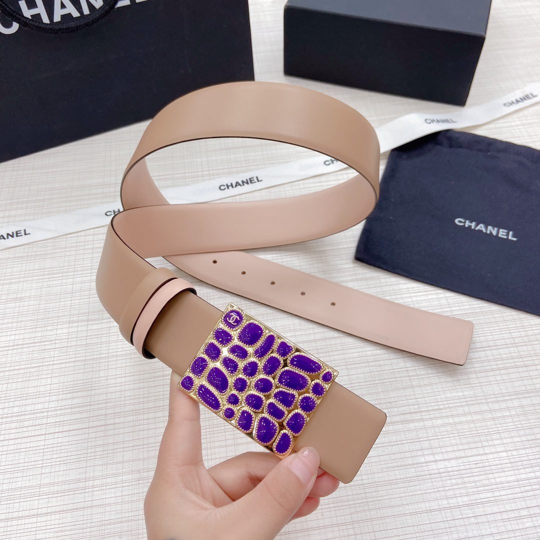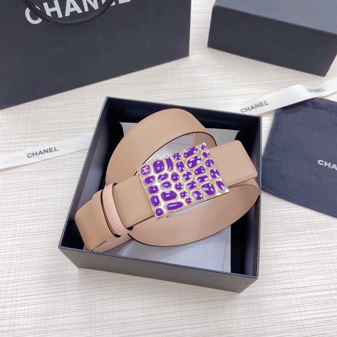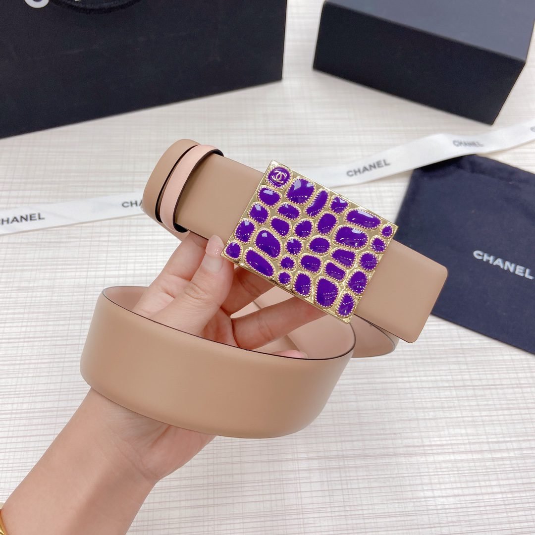 Chanel gold square inlaid with purple gemstone buckle and khaki colored belt, simple and elegant, classic and fashionable