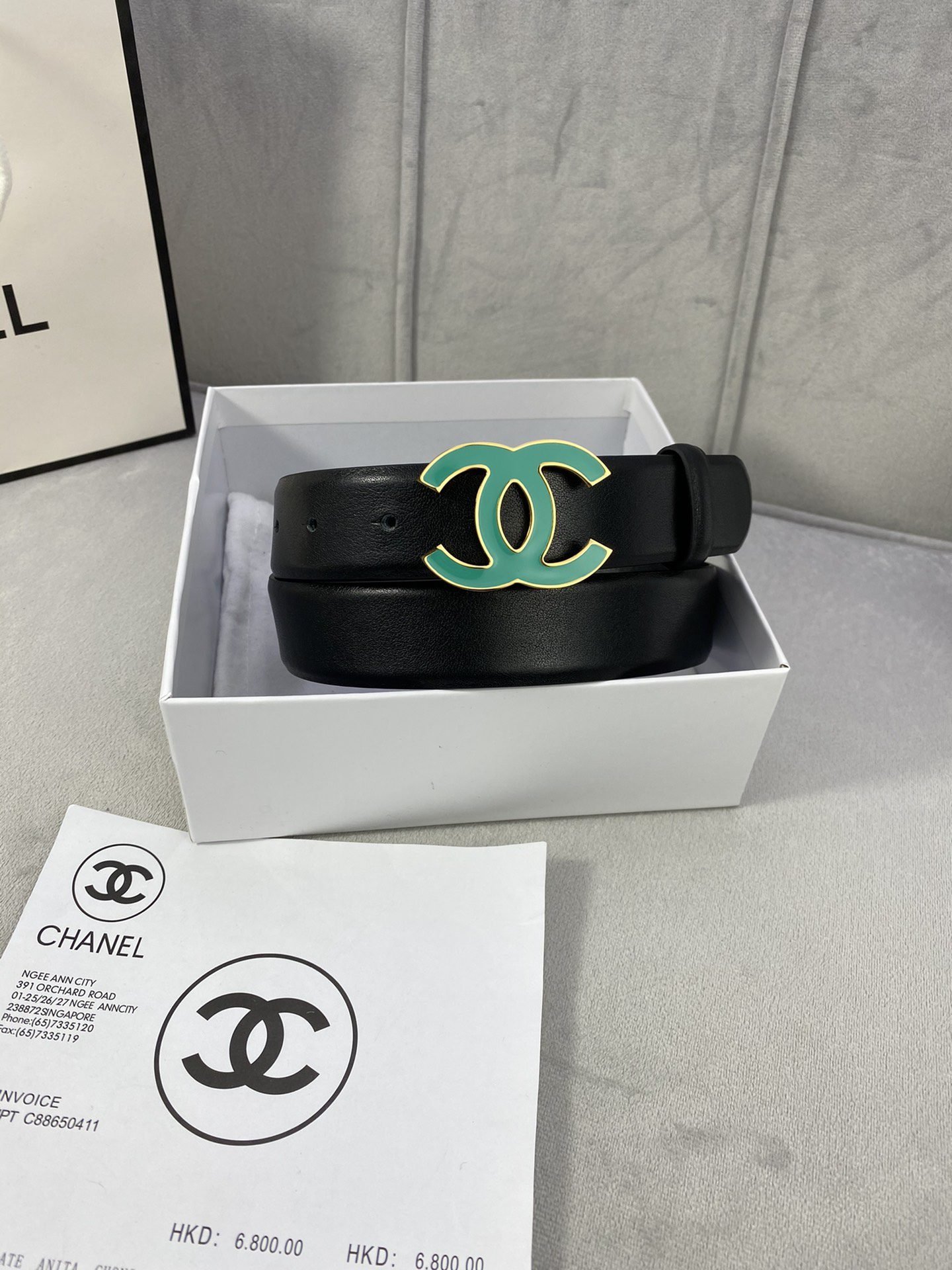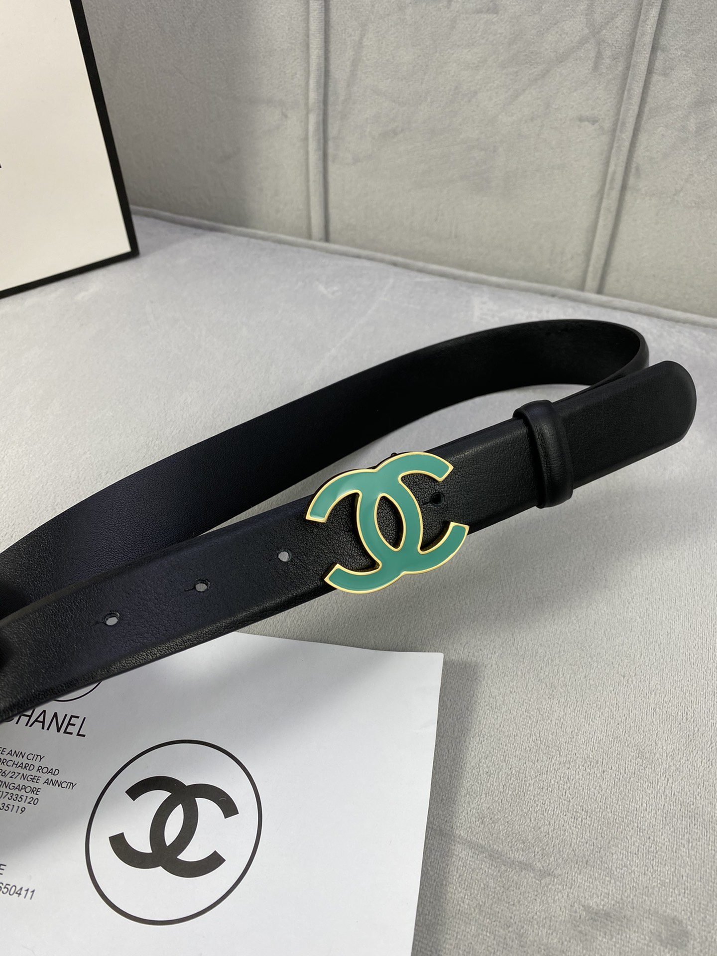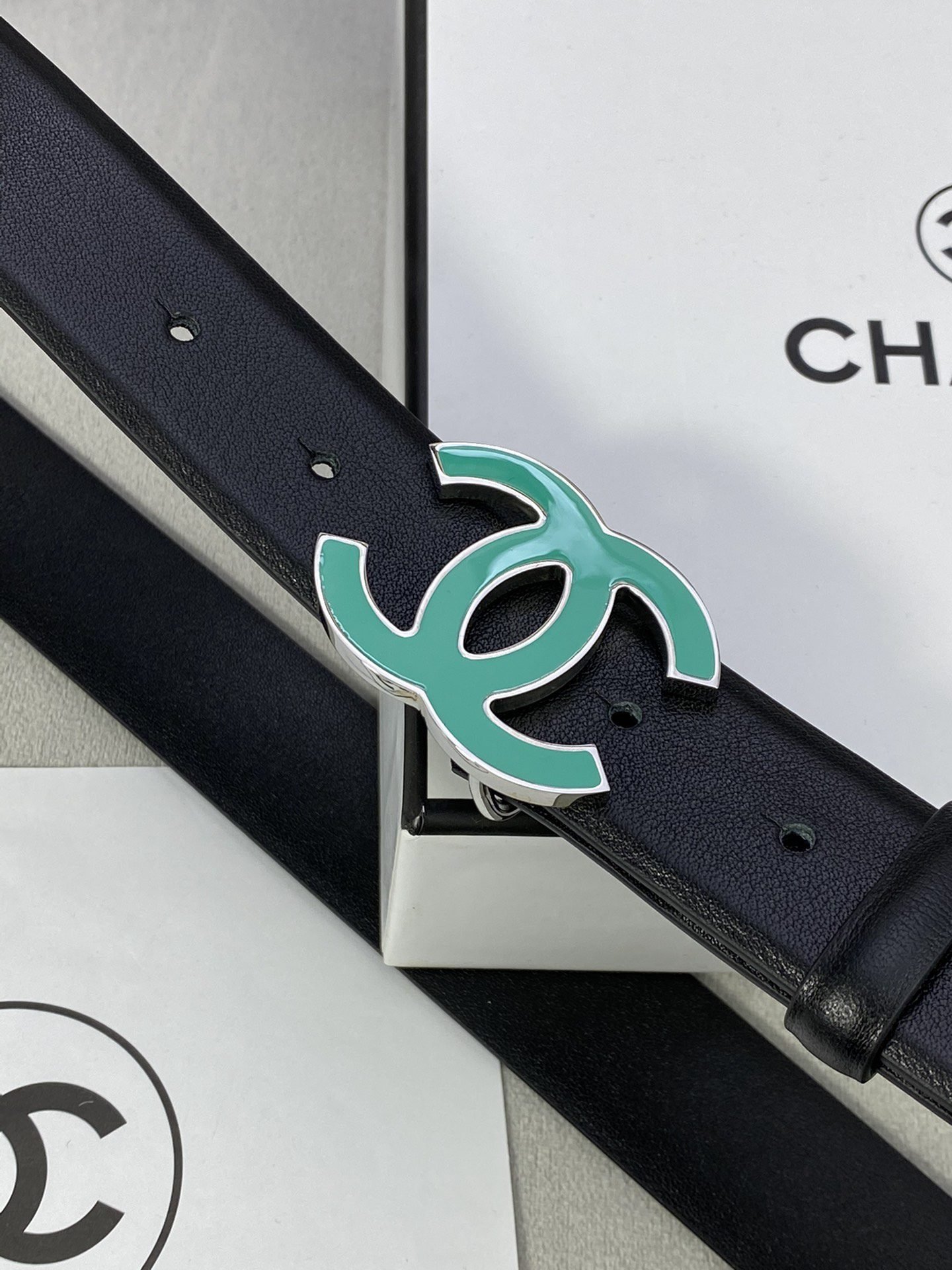 Chanel green double C-ring buckle black belt, simple, atmospheric, exquisite and elegant