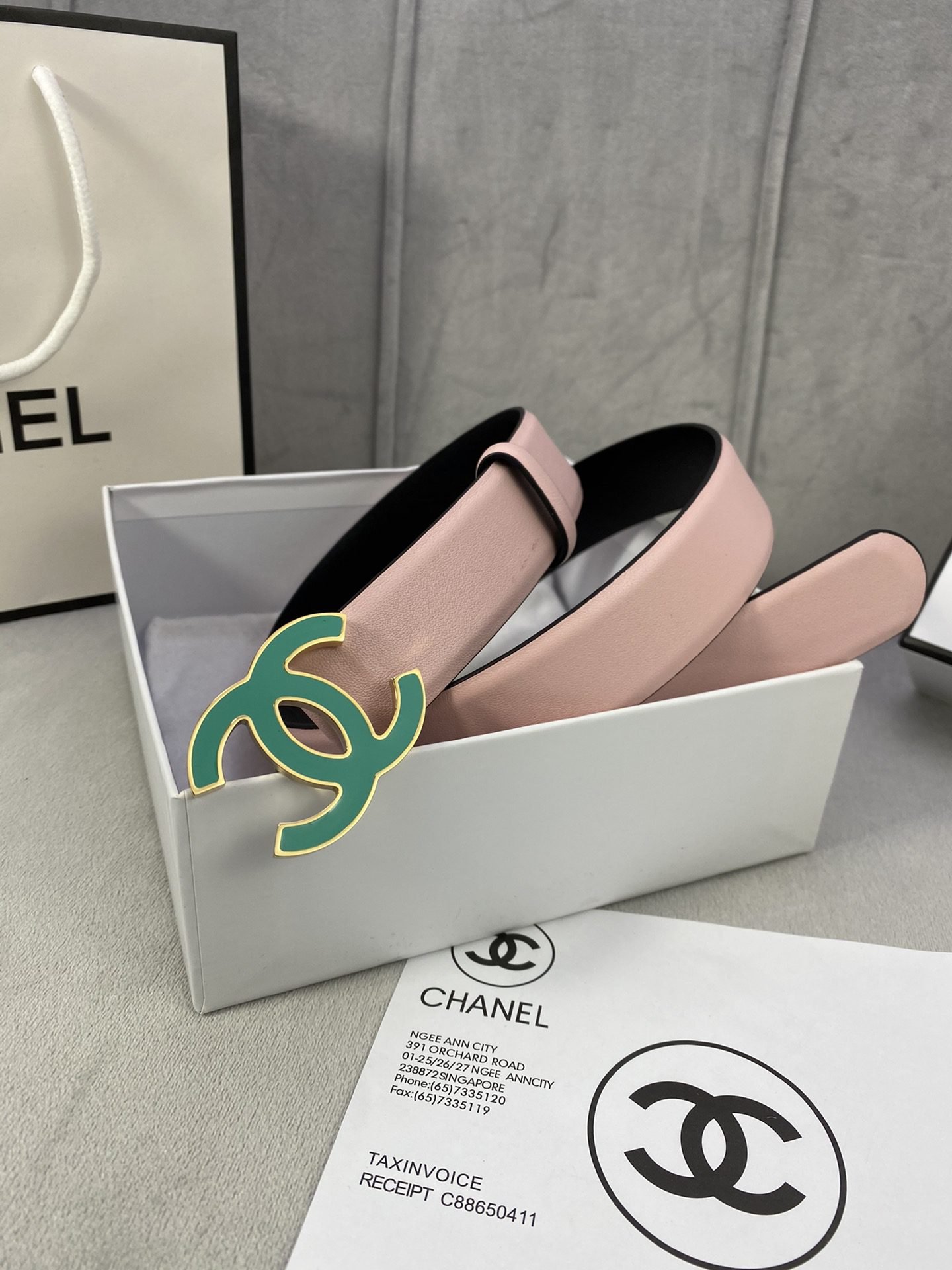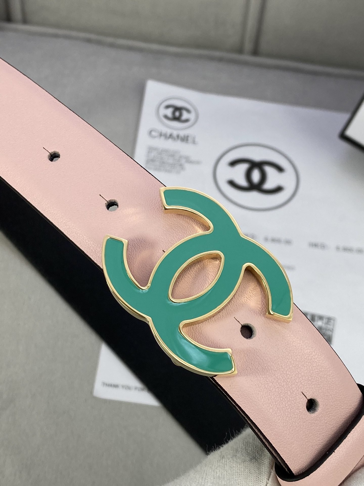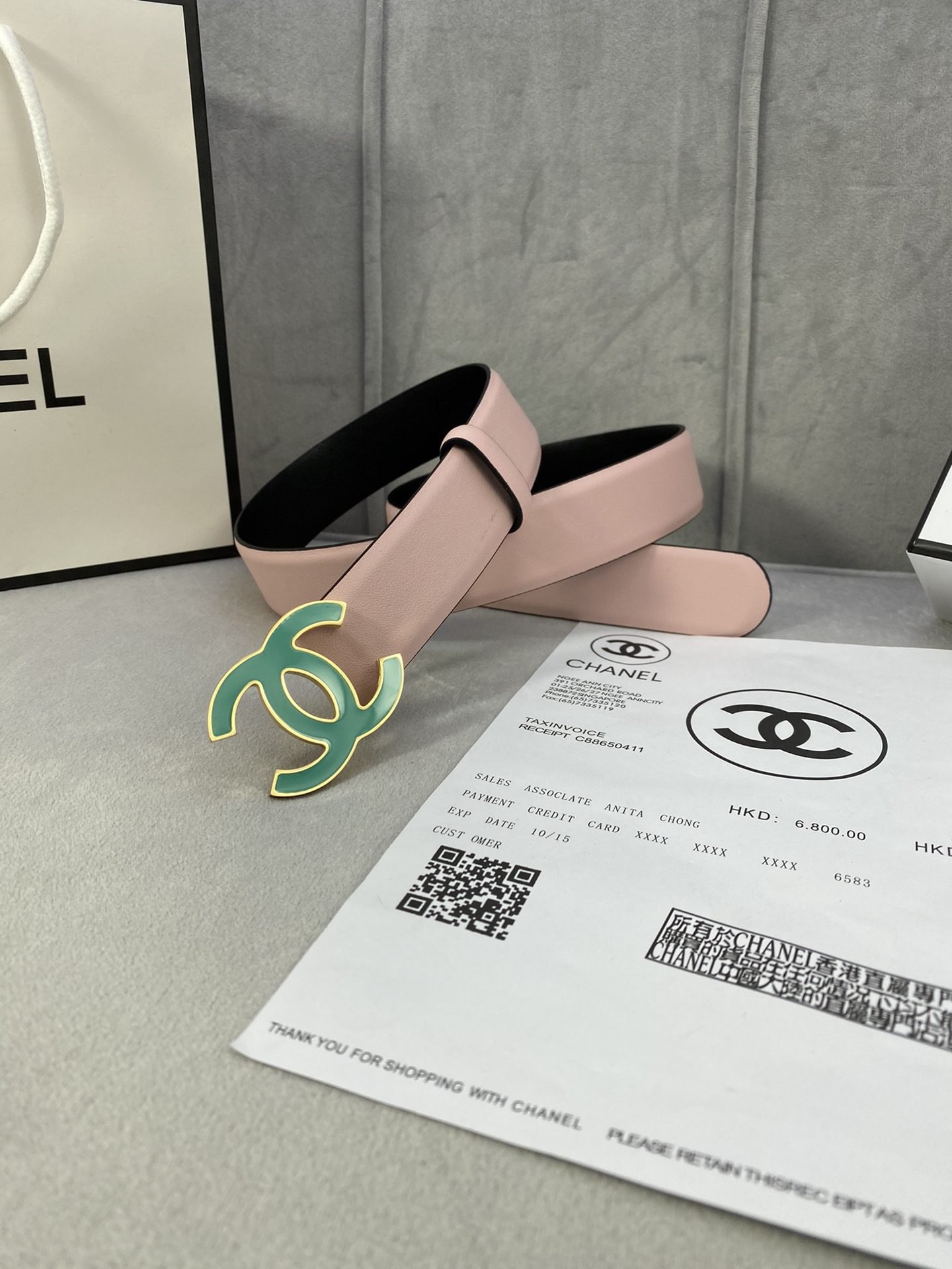 Chanel green double C-ring buckle pink belt, simple, atmospheric, exquisite and elegant