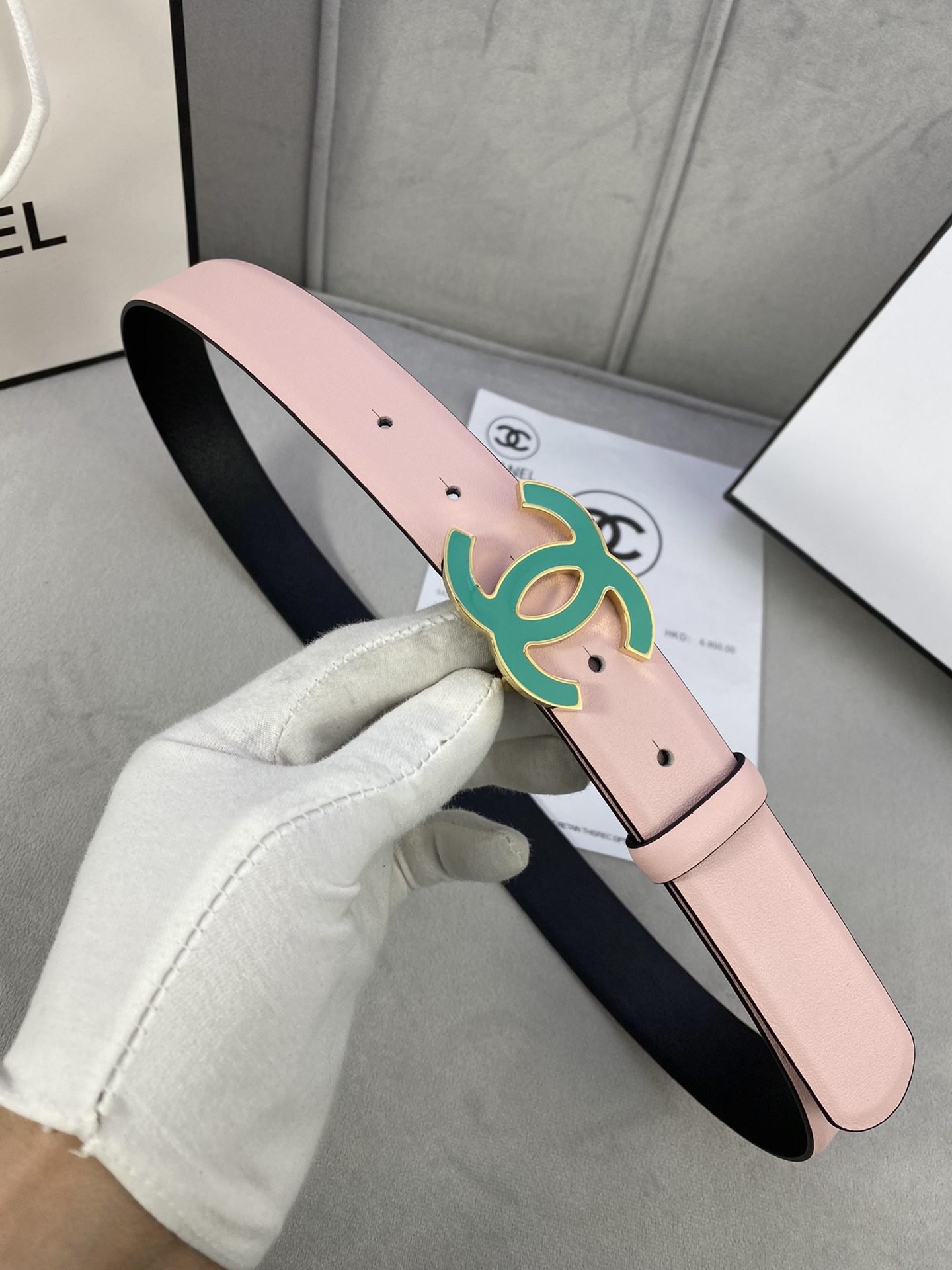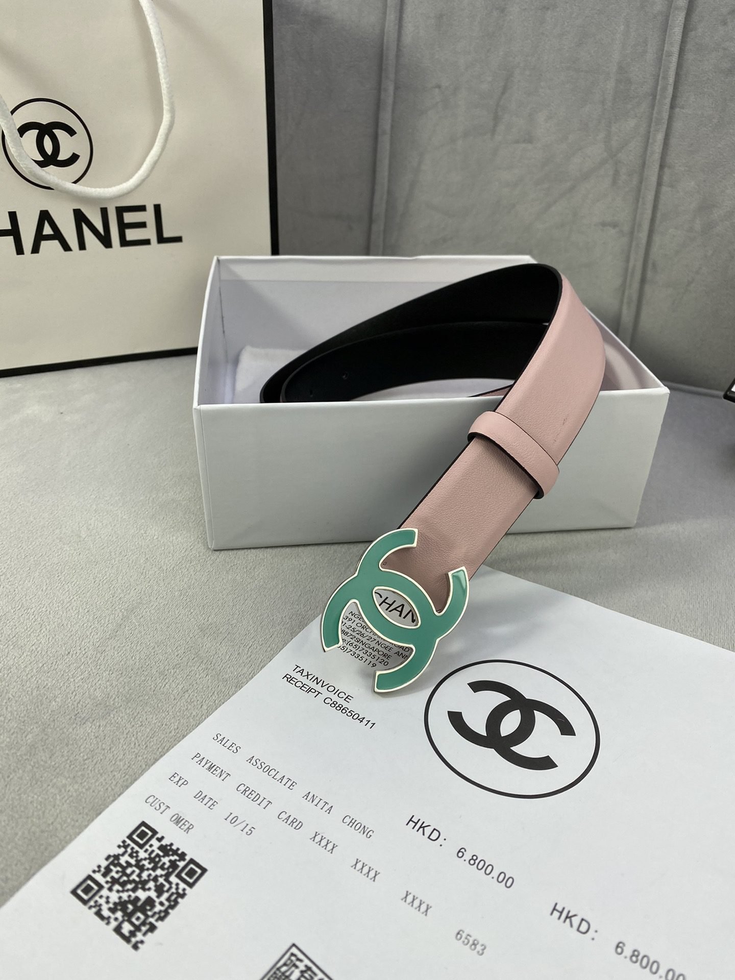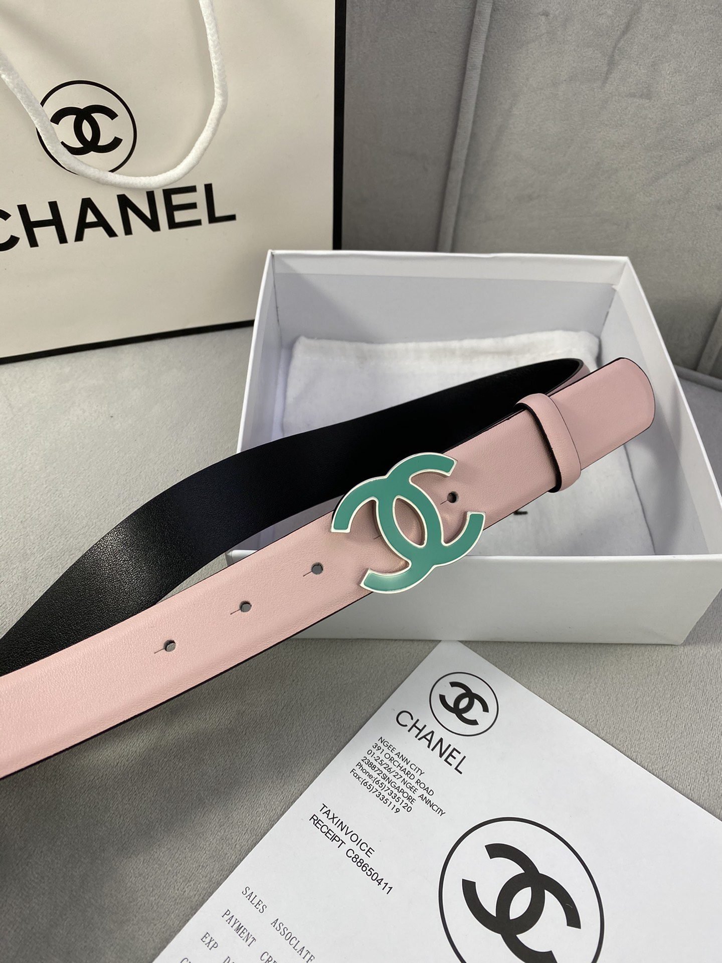 Chanel green double C-ring buckle pink belt, simple, atmospheric, exquisite and elegant