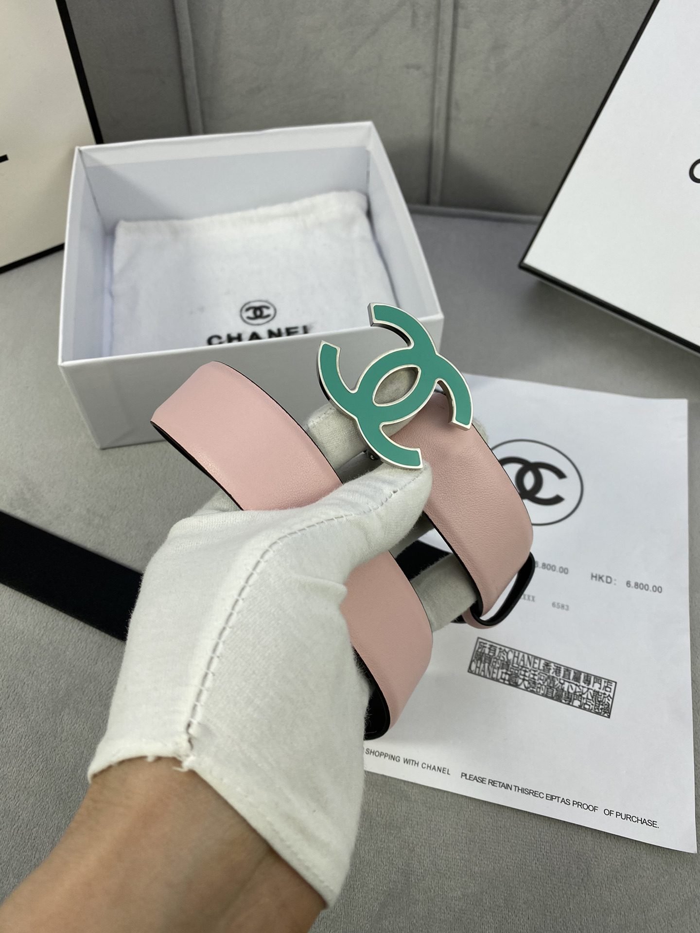 Home Belt CHANEL Belt Chanel green double C-ring buckle pink belt, simple, atmospheric, exquisite and elegant