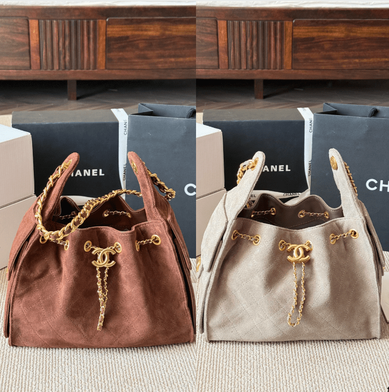 This Chanel quilted bucket bag showcases premium suede craftsmanship, featuring the iconic diamond quilting, signature gold CC hardware, a drawstring design, and a size of 25×20cm in sophisticated brown and beige hues. Embodying Chanel’s legacy of timeless elegance and textural luxury, this bag seamlessly merges classic sophistication with practical functionality. Perfect for those who appreciate a fusion of plush suede texture and iconic branding, it makes a refined statement suitable for any occasion, from daily outings to upscale events.
