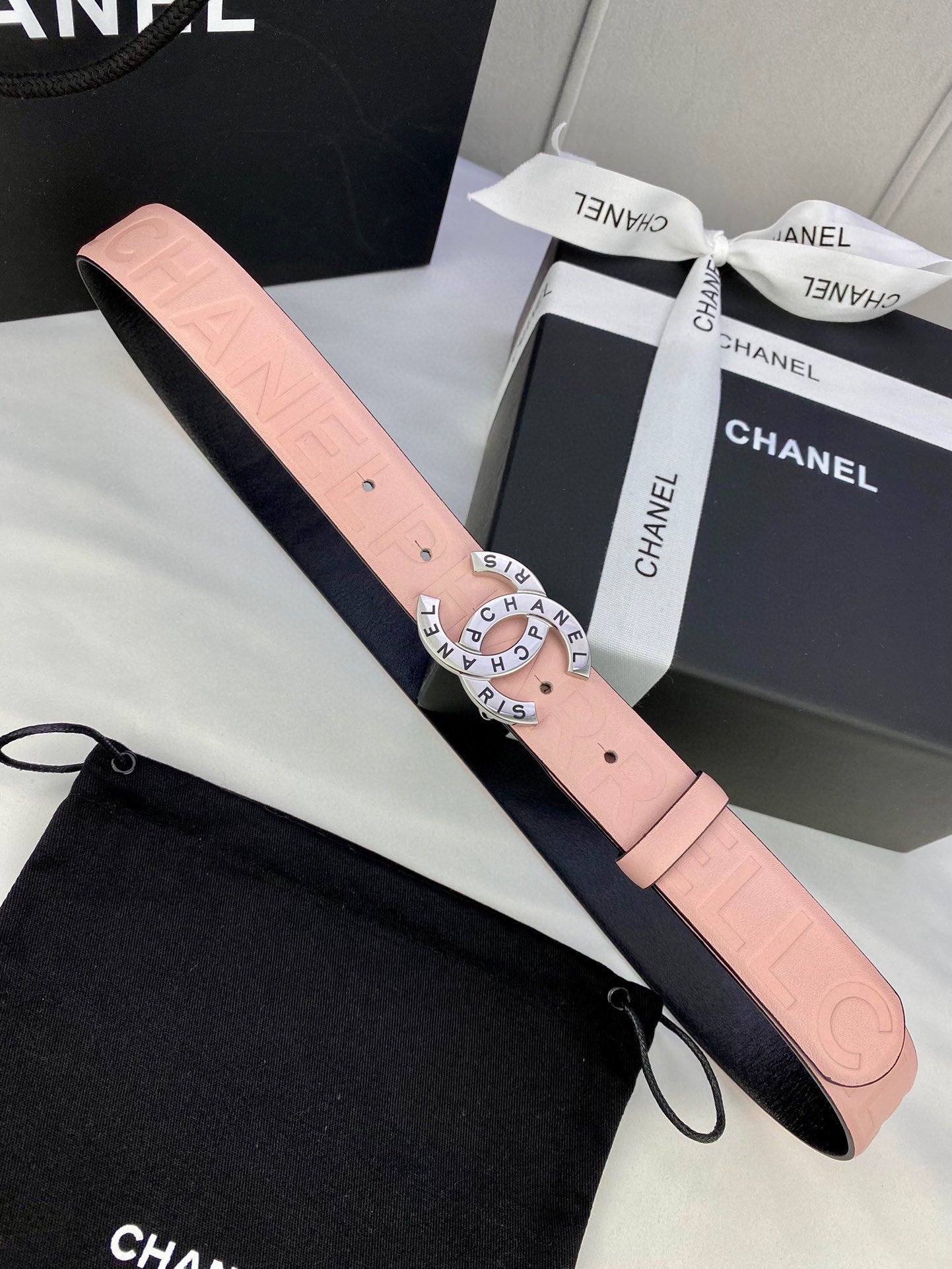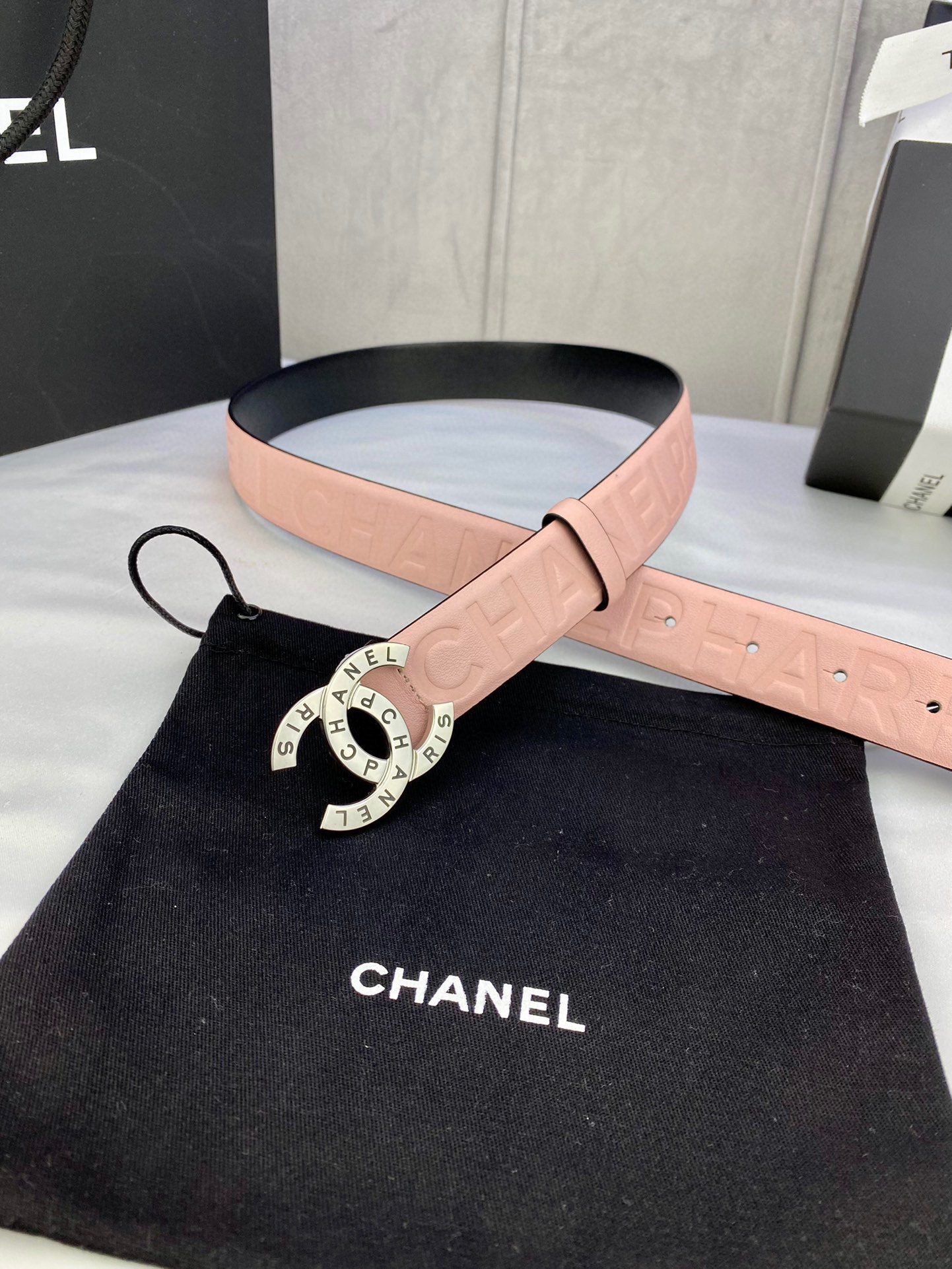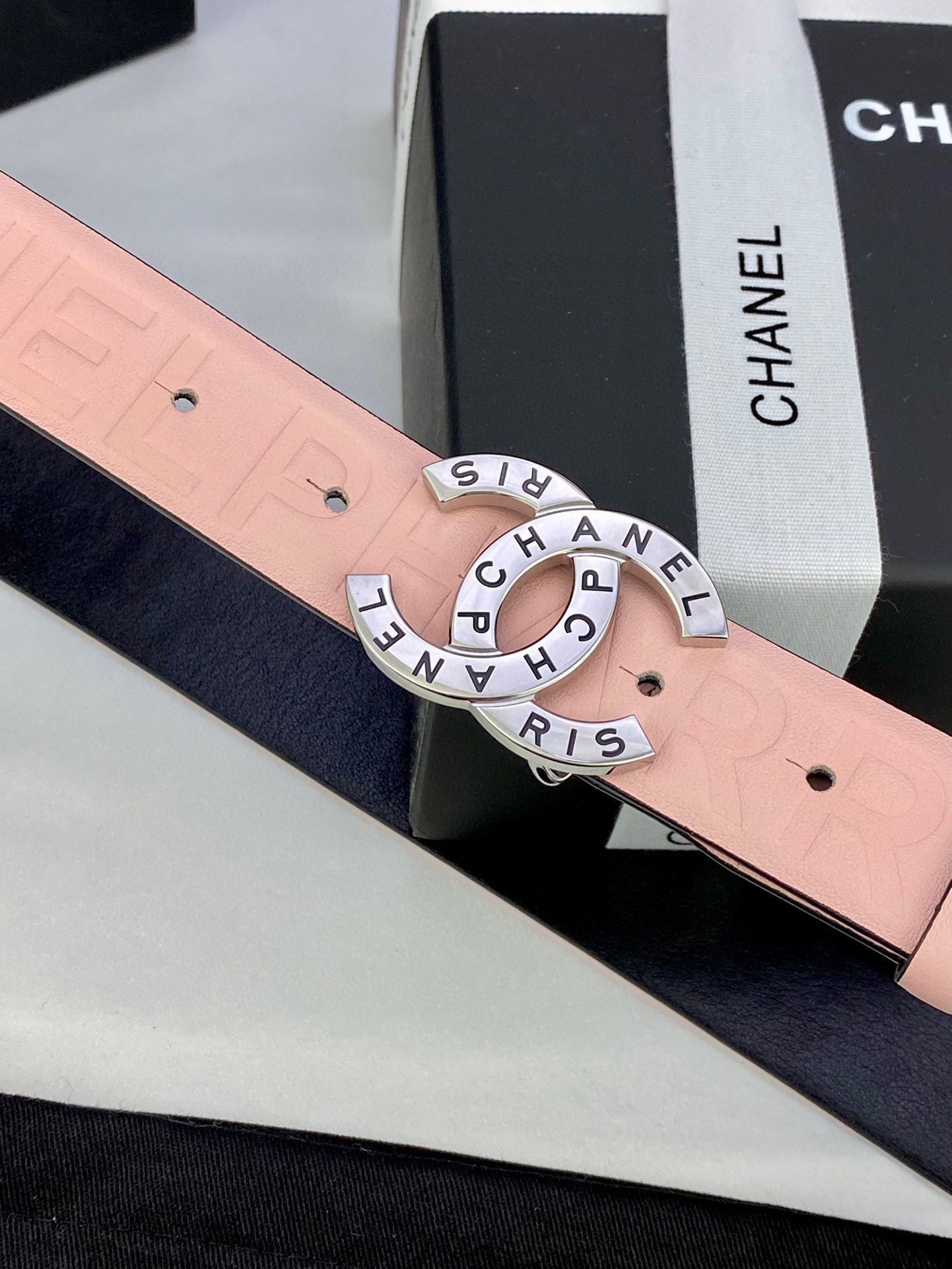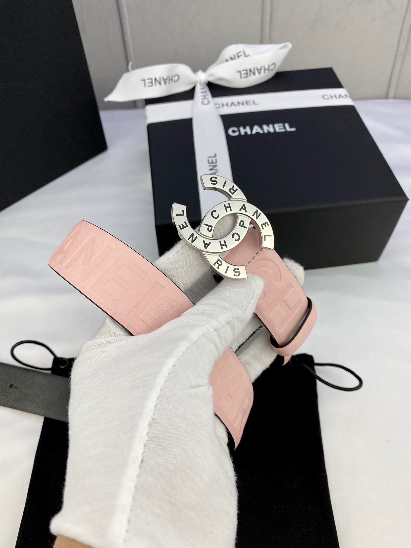 Home Belt CHANEL Belt Chanel Silver Double C-Ring Buckle Pink Belt Simple and Elegant, Low key Luxury
