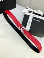 Home Belt CHANEL Belt Chanel Silver Double C-Ring Buckle Red Belt Simple and Elegant, Low key Luxury