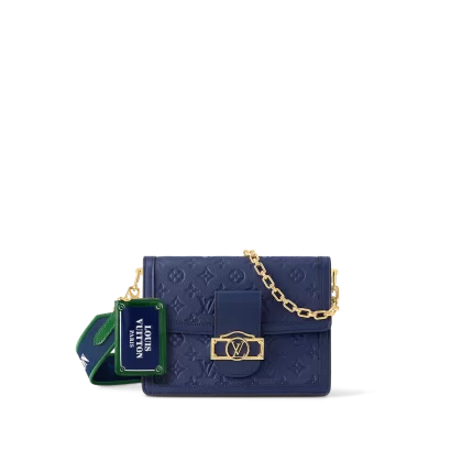 The elegant Dauphine MM handbag is fashioned from blue calfskin with a gold-color LV lock, removable chain, and handle mounts.