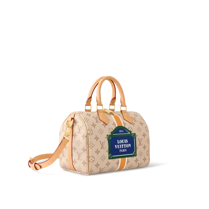 The Speedy Bandoulière 25’s emblematic shape is made from beige Monopaname canvas with a central vertical strip in white, ocher,