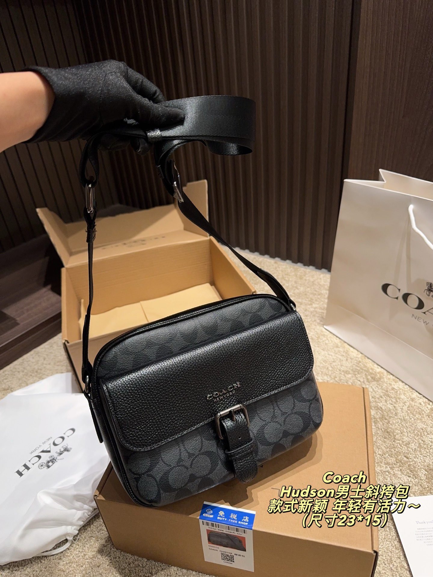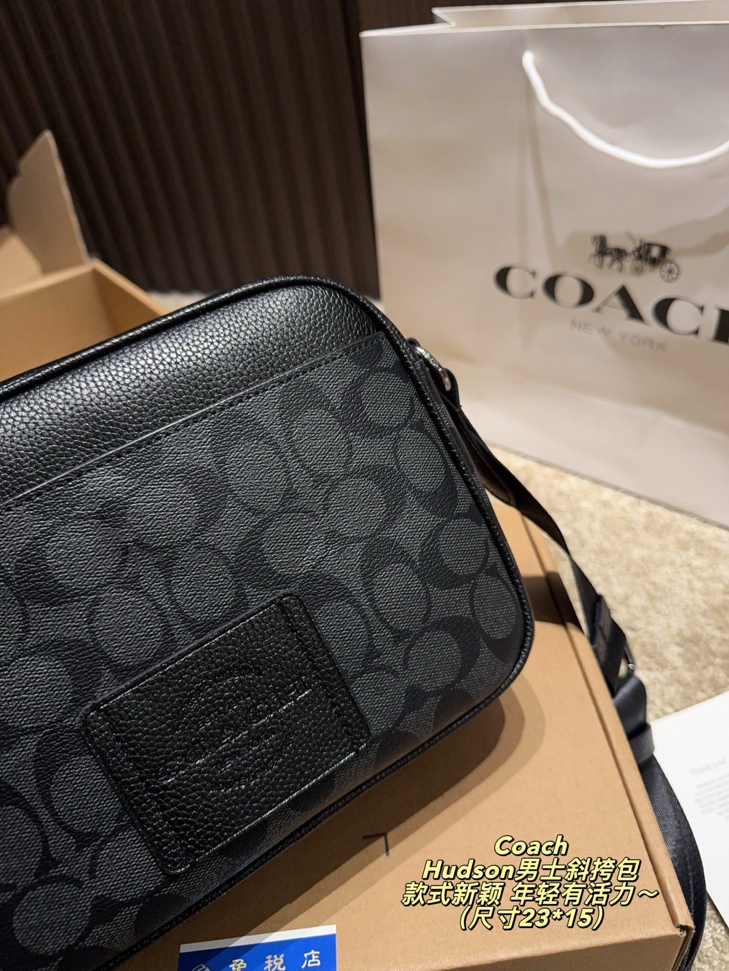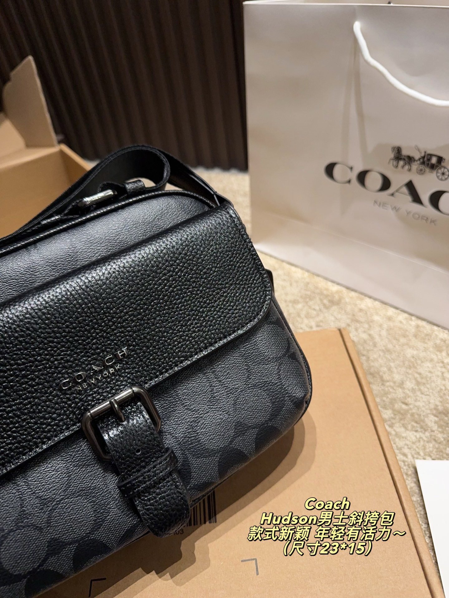 This COACH Hudson men’s crossbody bag features the brand’s iconic monogram pattern, crafted from premium coated canvas and leather trim, with a structured silhouette of 23×15cm. Embodying COACH’s legacy of youthful dynamism and contemporary design, it comes with an adjustable crossbody strap and a buckle detail for stylish functionality. The sleek black-grey hue adds a trendy touch, making it perfect for those who appreciate iconic branding, meticulous craftsmanship, and a fashion-forward accessory that brings a lively, modern vibe to both casual and smart-casual outfits.