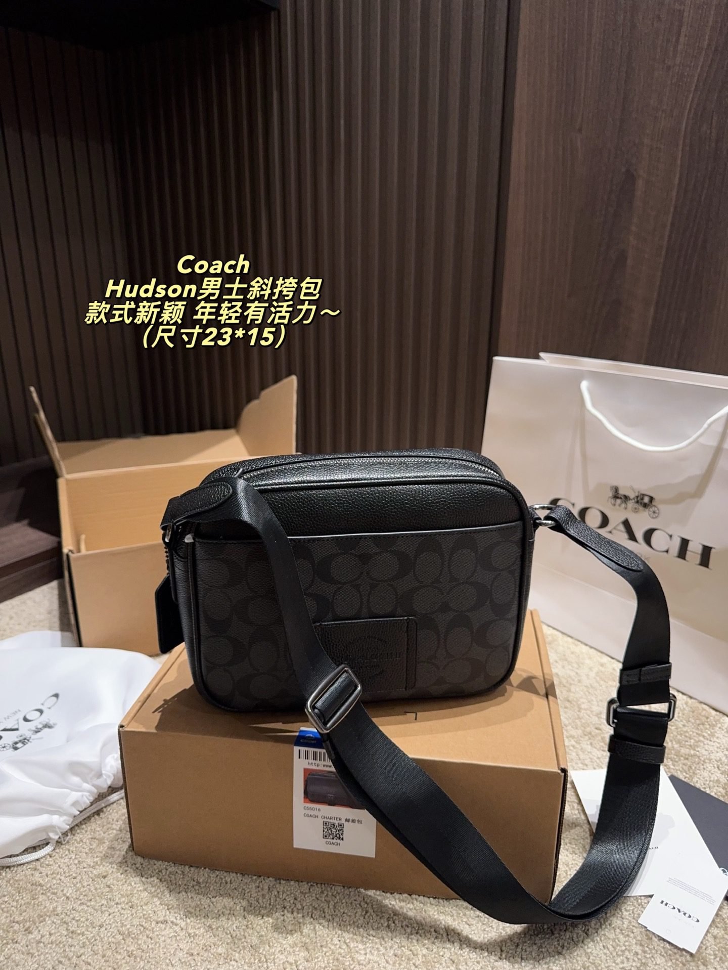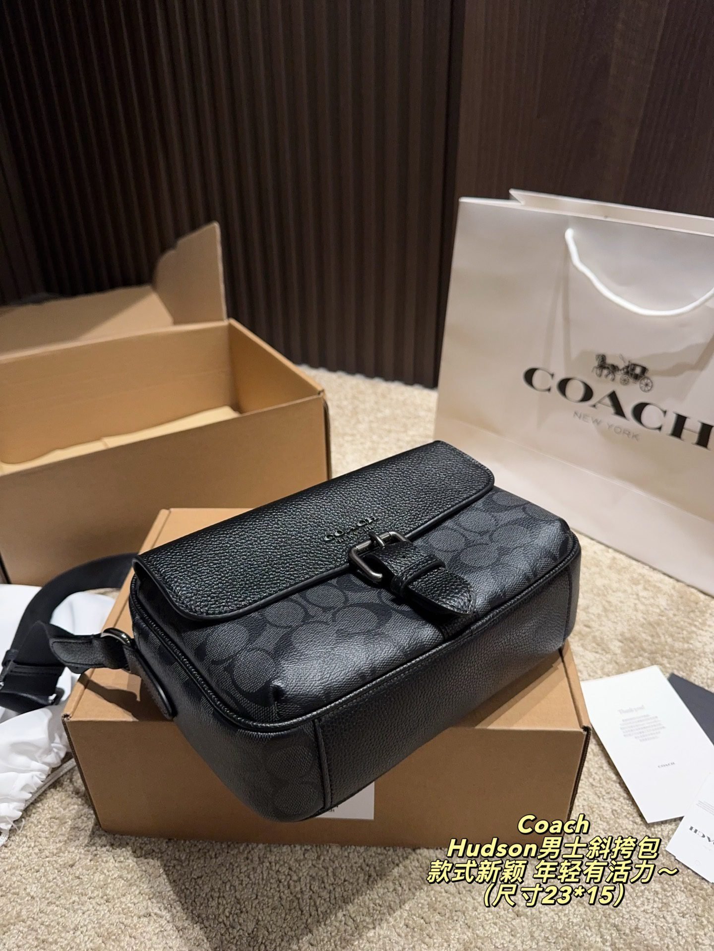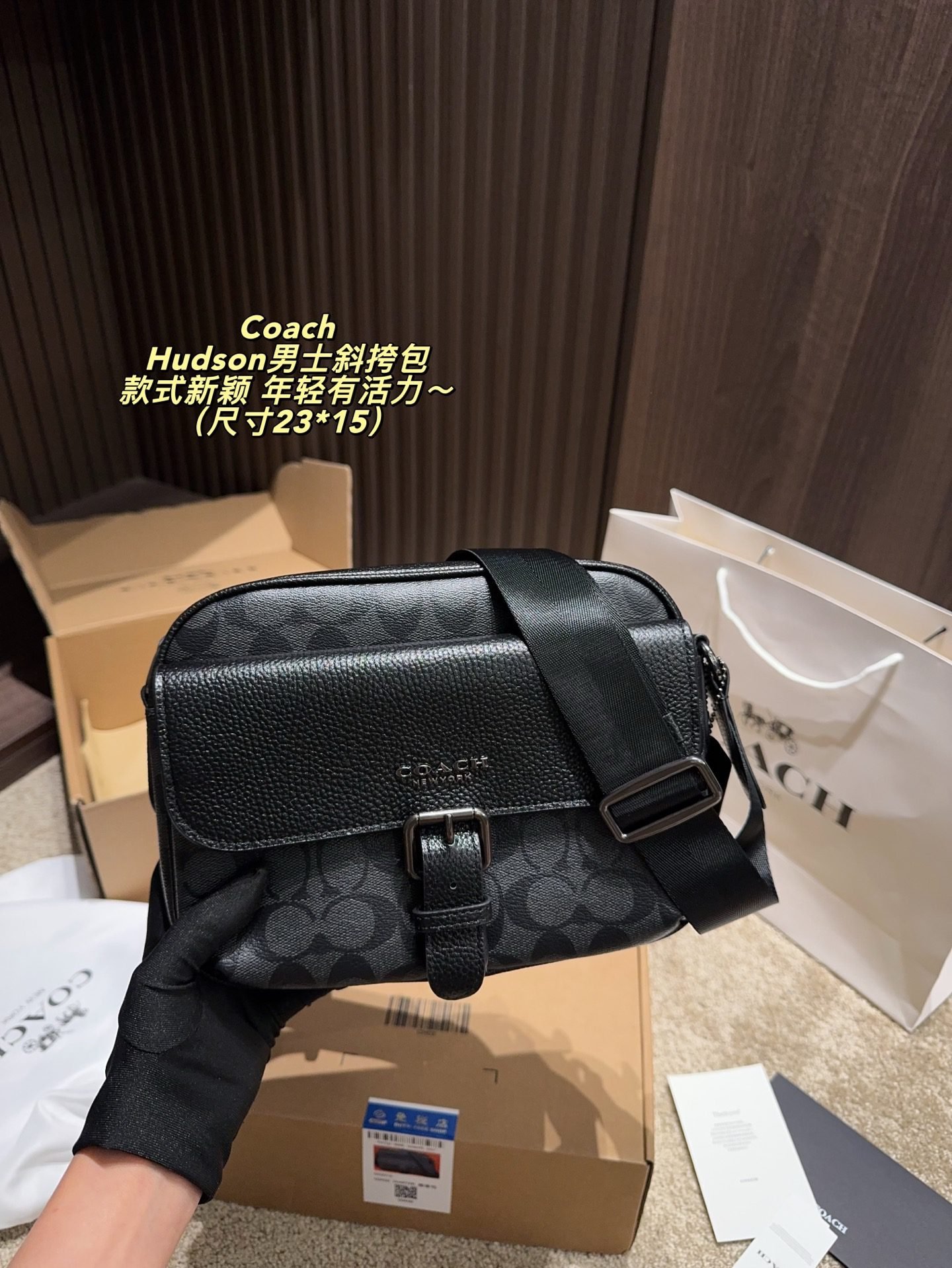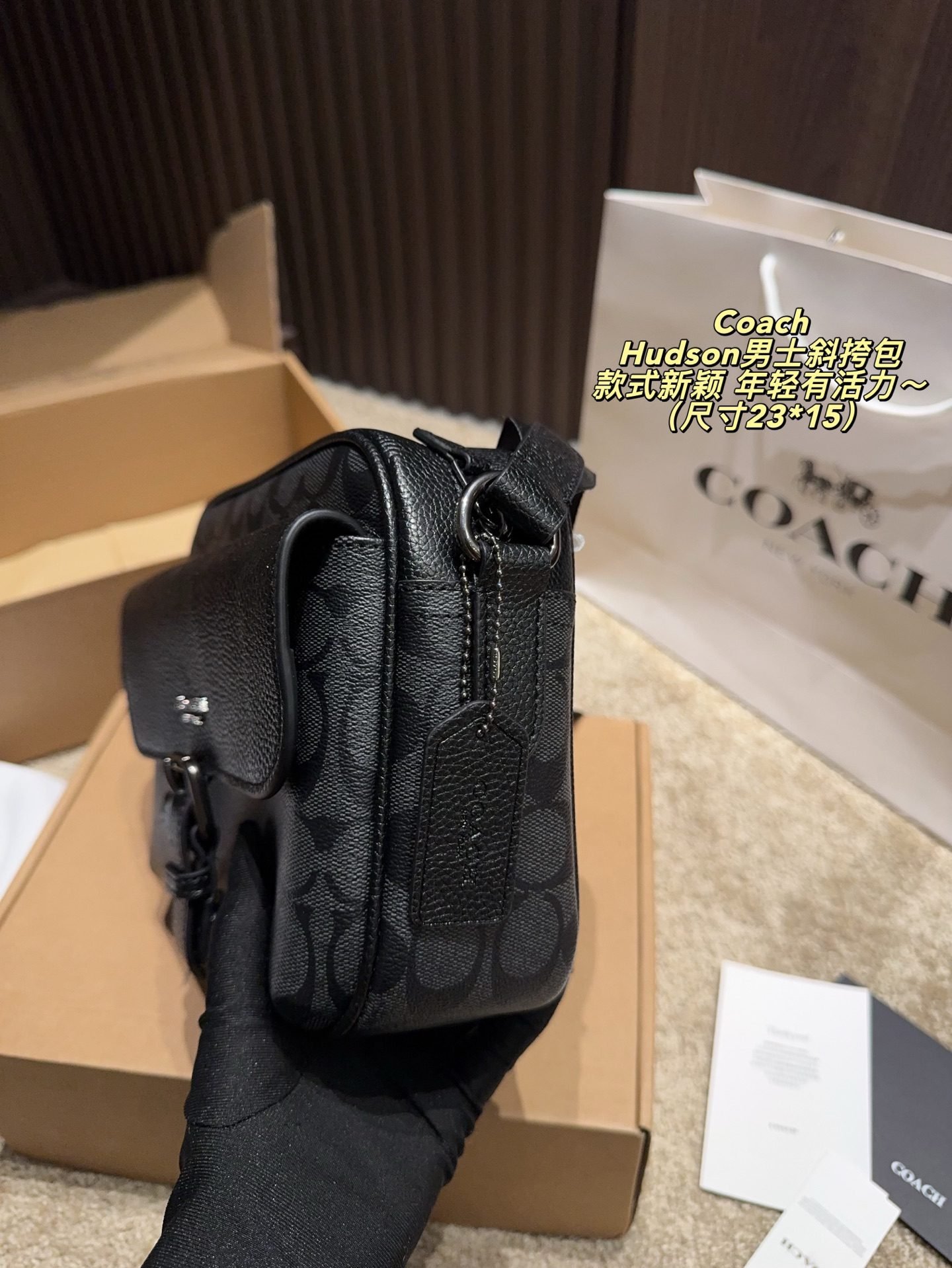 This COACH Hudson men’s crossbody bag features the brand’s iconic monogram pattern, crafted from premium coated canvas and leather trim, with a structured silhouette of 23×15cm. Embodying COACH’s legacy of youthful dynamism and contemporary design, it comes with an adjustable crossbody strap and a buckle detail for stylish functionality. The sleek black-grey hue adds a trendy touch, making it perfect for those who appreciate iconic branding, meticulous craftsmanship, and a fashion-forward accessory that brings a lively, modern vibe to both casual and smart-casual outfits.