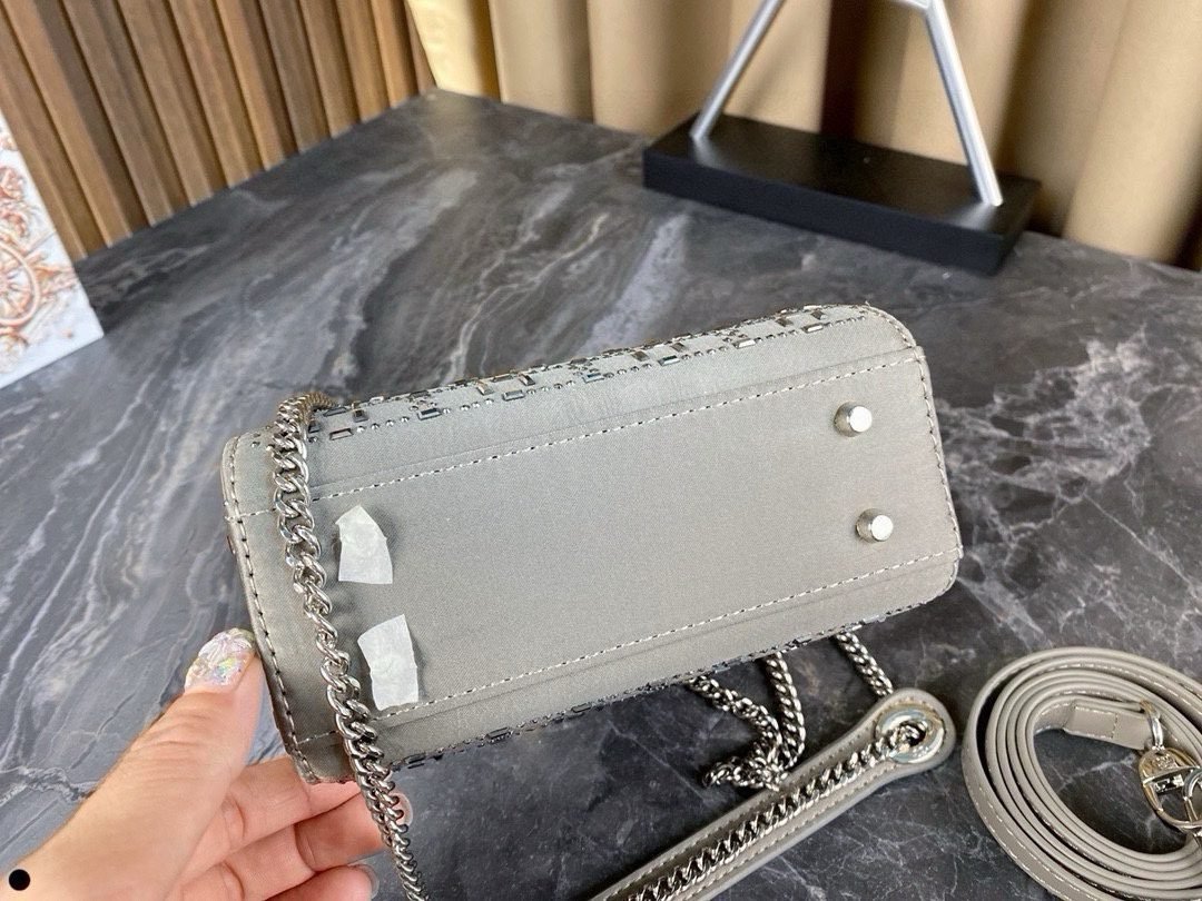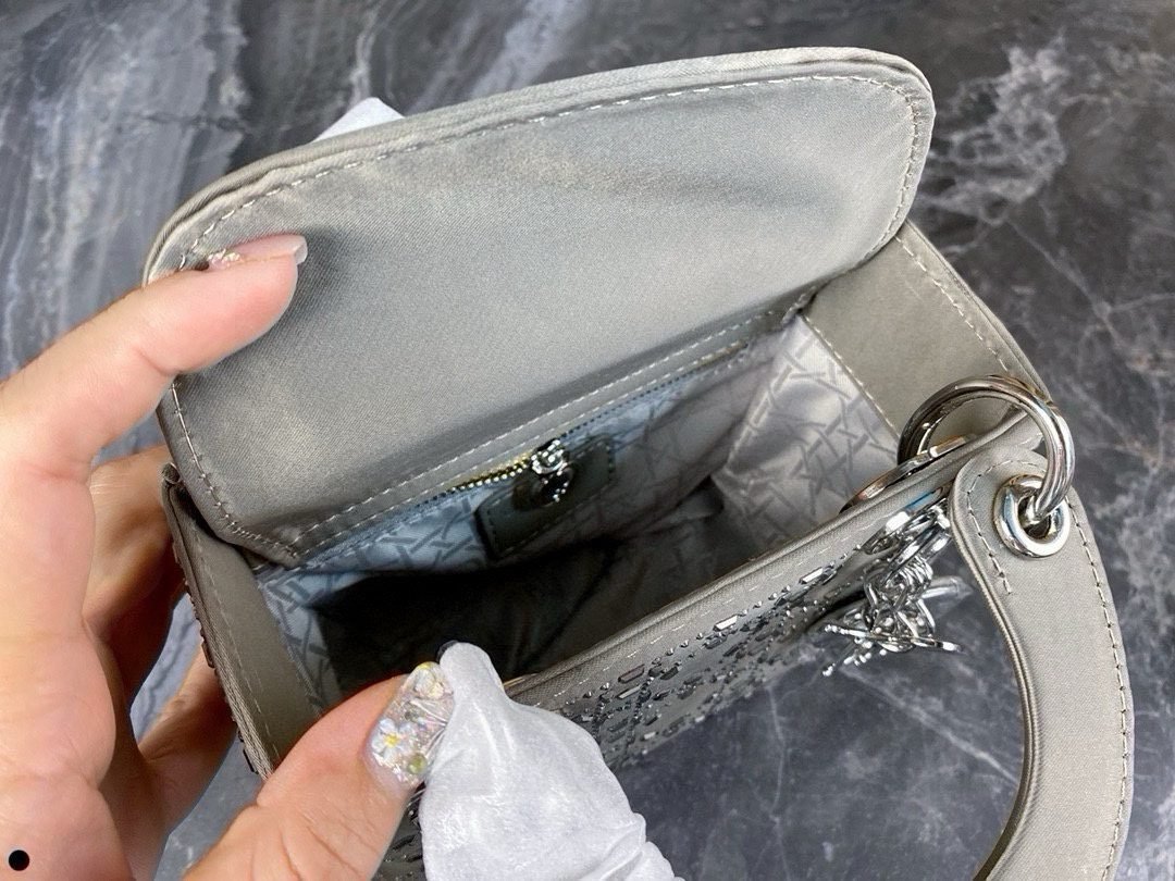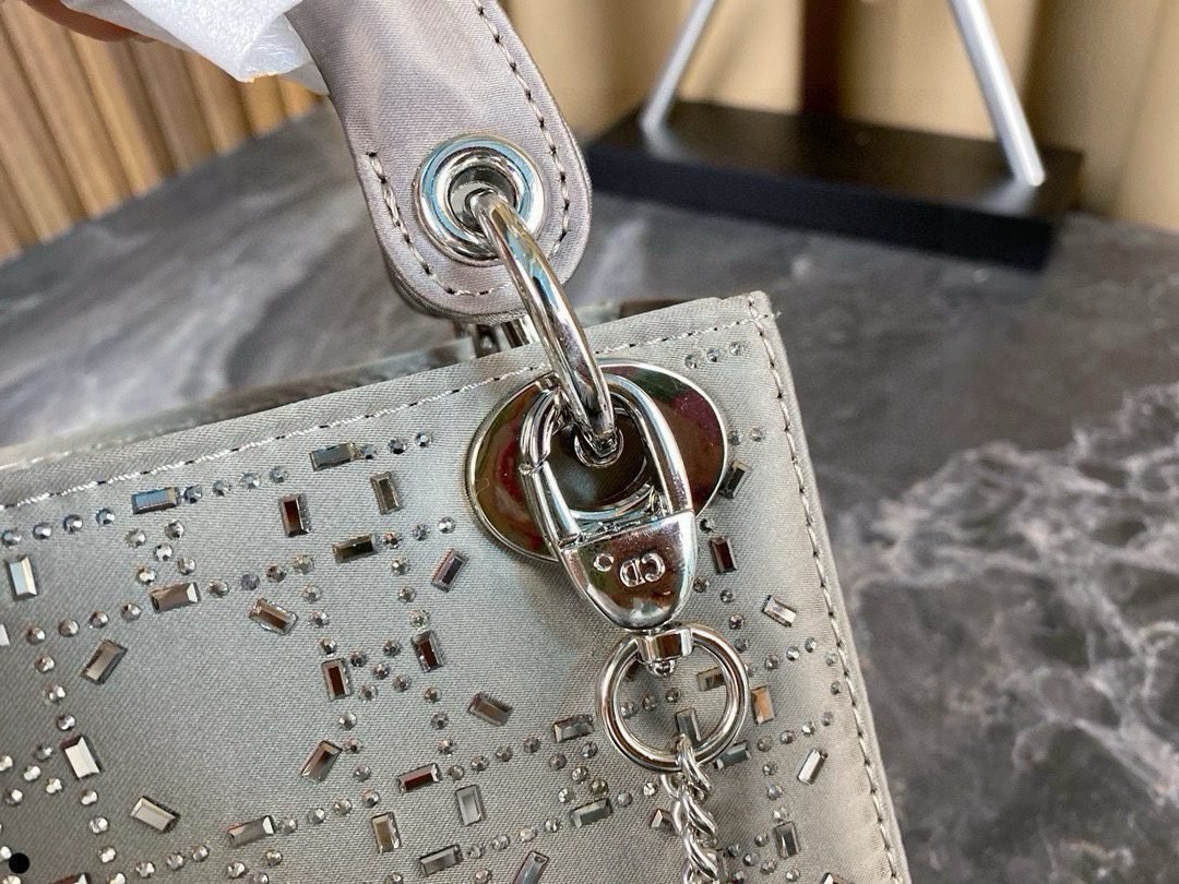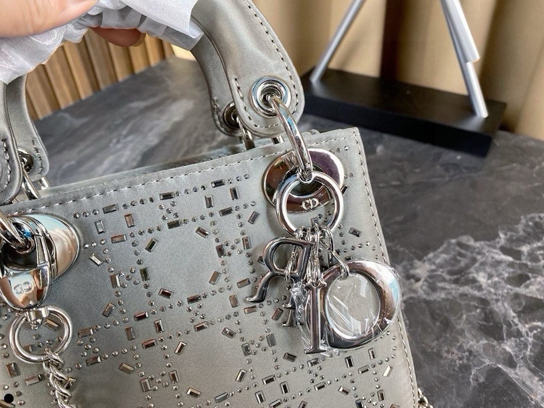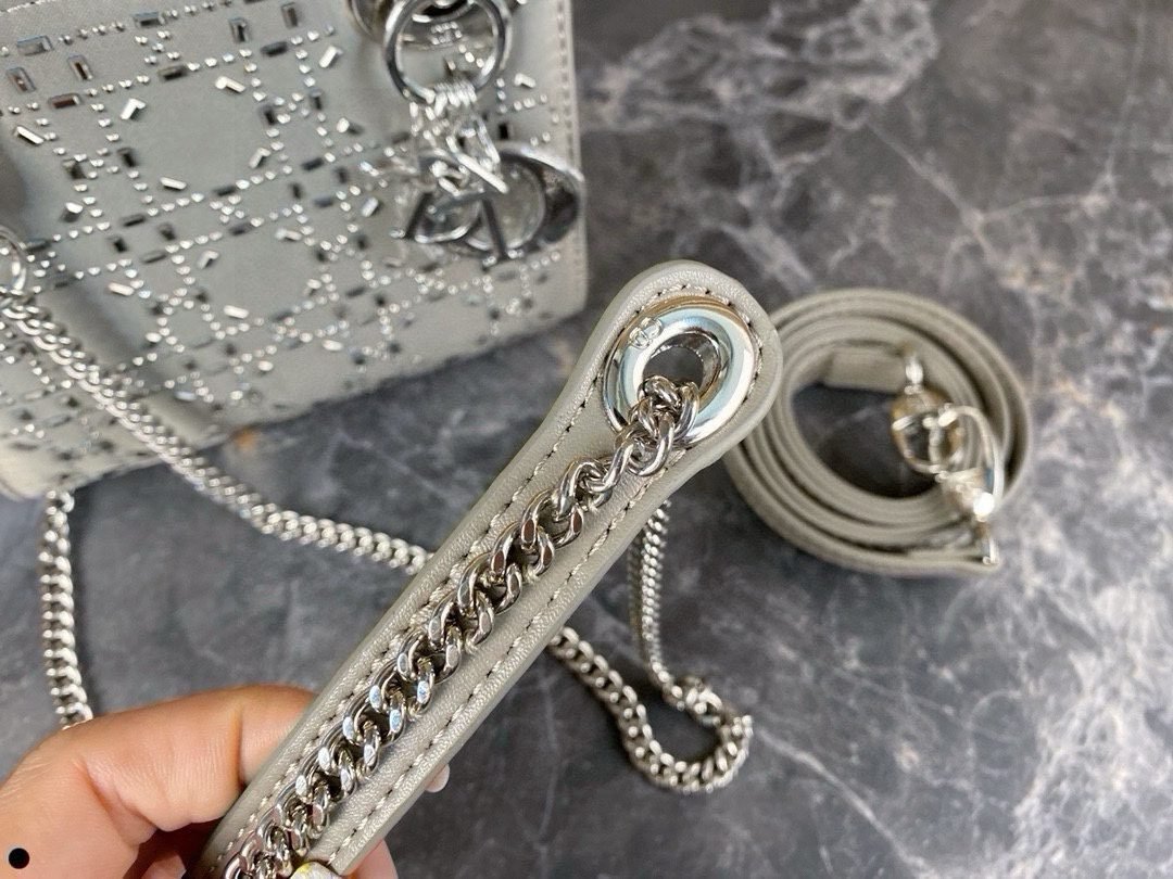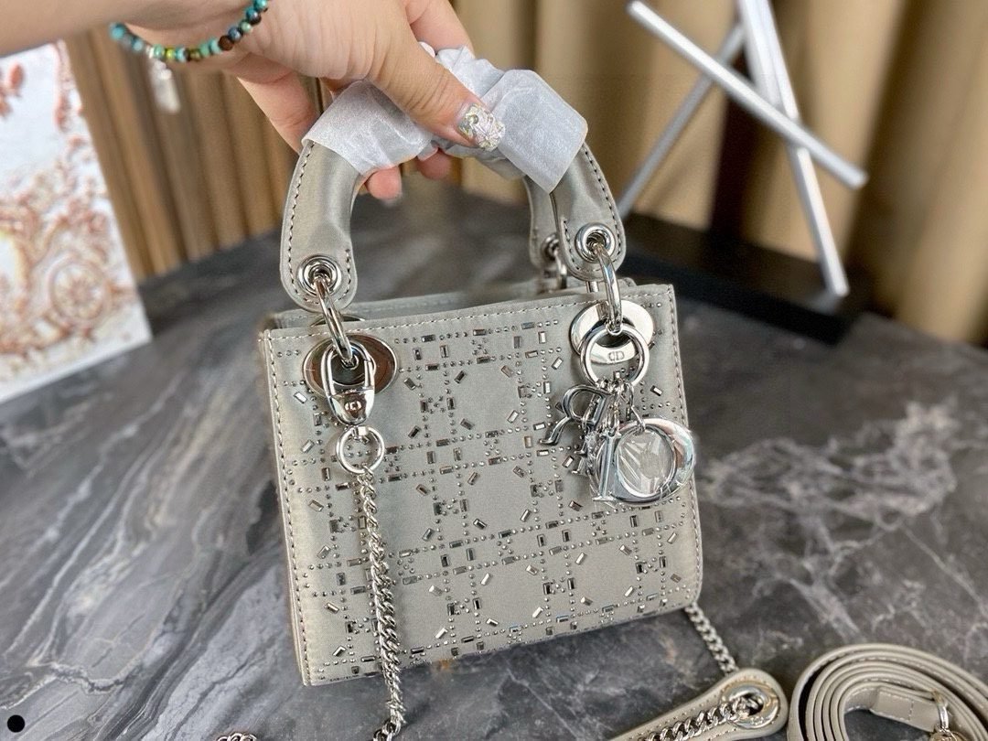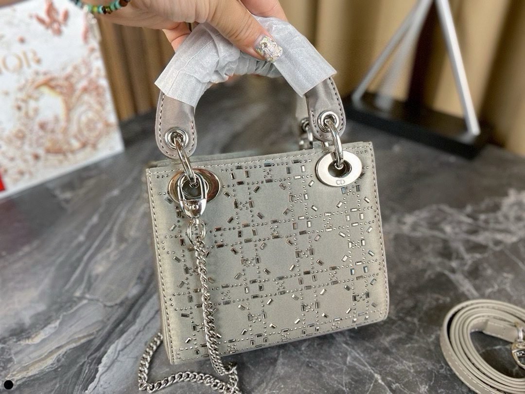 This Dior Mini Lady Dior bag showcases a stunning crystal-embellished Cannage pattern, featuring signature metal charms, a compact size of 17×14cm, and a luminous silver hue. Embodying Dior’s legacy of luxurious craftsmanship and glamorous design, this bag merges iconic details with eye-catching sparkle. Perfect for those who seek to make a bold fashion statement, it adds a touch of opulence to any ensemble, ideal for special occasions or as a standout accessory.