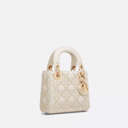 DIOR / MINI LADY DIOR BAG Latte Crinkle-Effect Lambskin with White Resin Half-Pearl Cannage Motif M0505OWFX_M941