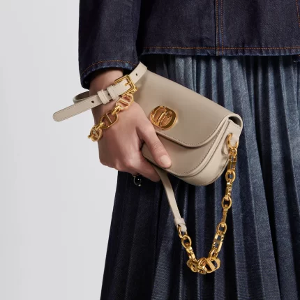 calfskin, the rounded flap with delicate curves is punctuated by an antique gold-finish metal CD twist clasp inspired by the