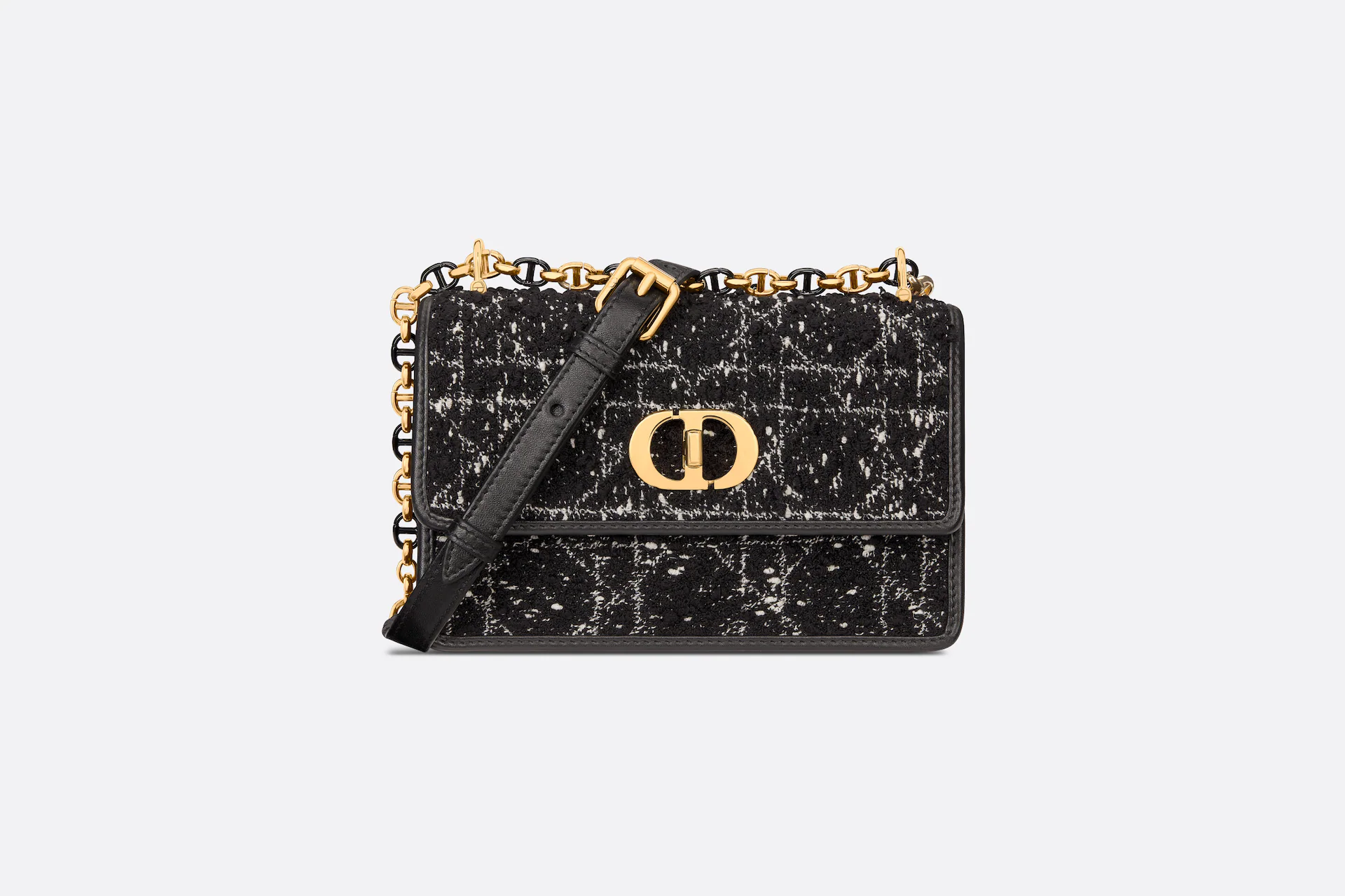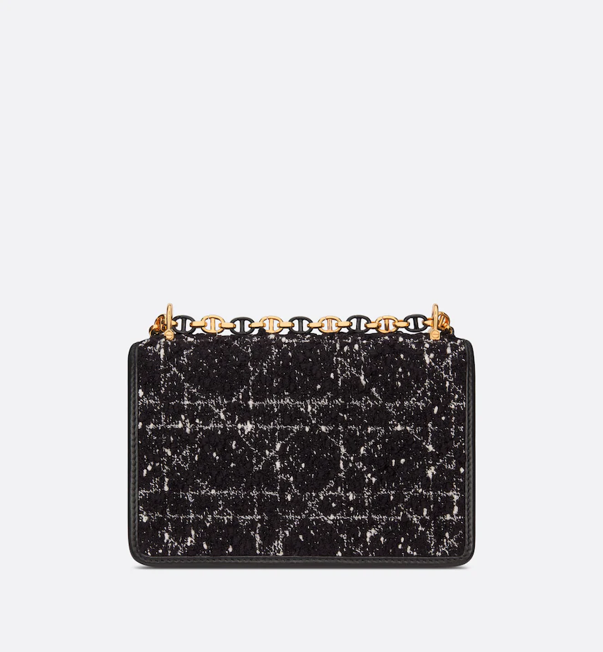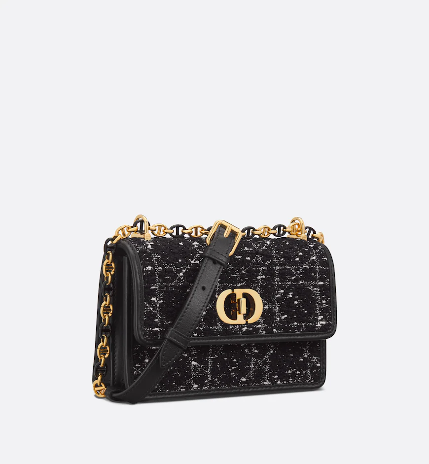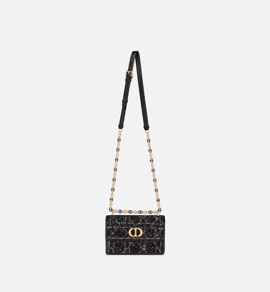 The Miss Caro mini bag enhances the Dior Caro line with modern and timeless elegance. Crafted in black embroidery with a tweed-effect texture, it is embellished with a mix of threads displaying the Cannage motif, as well as a flap accented by a gold-finish metal CD twist clasp inspired by the seal of a Christian Dior perfume bottle. Alternating between gold-finish metal links and tonal enamel links that match the leather, the adjustable chain shoulder strap has a leather insert for added comfort when carrying the bag by hand or wearing it crossbody.