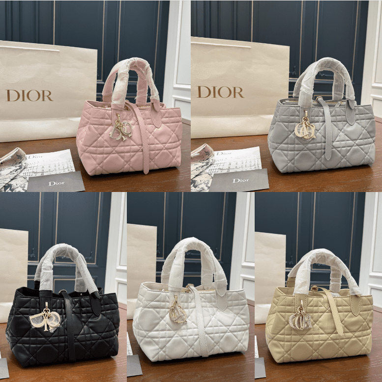 This Dior quilted leather tote bag collection showcases the iconic Cannage pattern, featuring signature charm details, a versatile top handle design, and two sizes (small:22×14cm, large:28×21cm) in a range of elegant hues including pink, gray, black, white, and beige. Embodying Dior’s legacy of sophisticated elegance and functional luxury, these totes seamlessly merge classic design with modern versatility. Perfect for those who appreciate a fusion of tactile leather, iconic branding, and varied sizing, they make a refined statement suitable for any occasion, from daily outings to upscale events.